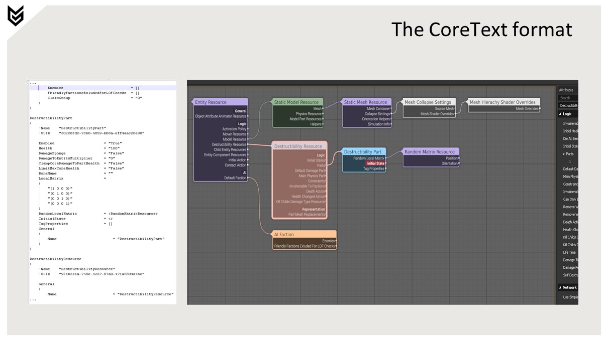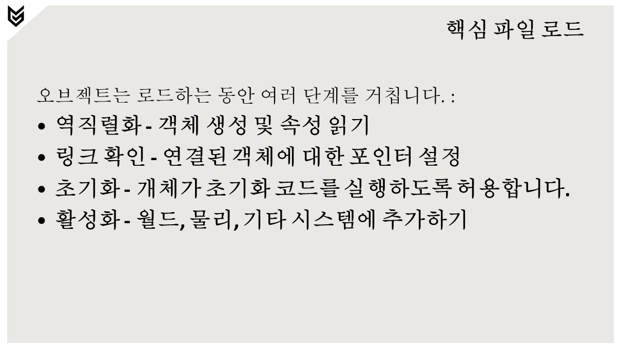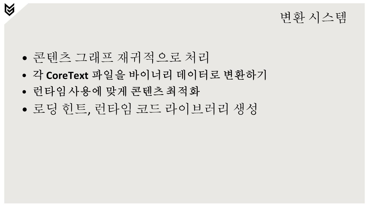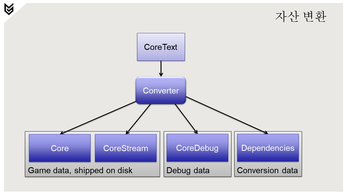 CoreText 파일은 바이너리 .Core 파일로 변환됩니다.프로세싱은 입력 데이터를 런타임 형식으로 변환합니다.텍스처, 메시, 애니메이션, 피직스 등.스트리밍 데이터는 .CoreStream 파일에 기록됩니다.디버그 데이터는 .CoreDebug 데이터에 기록됩니다.