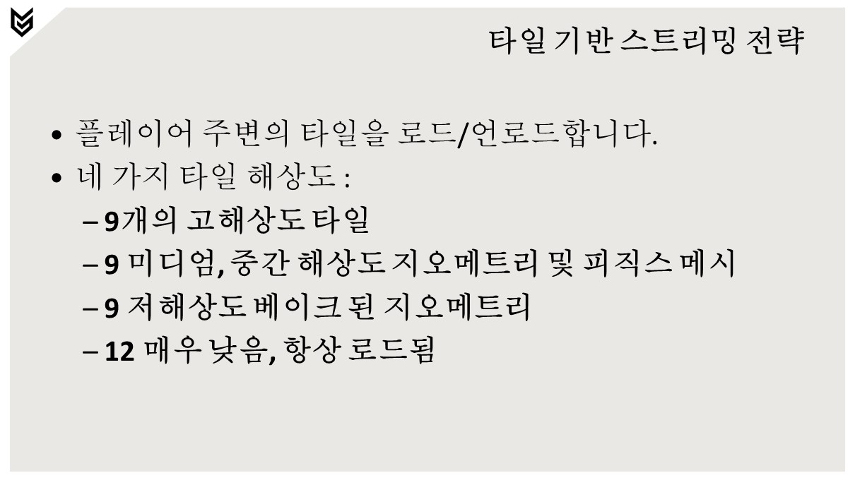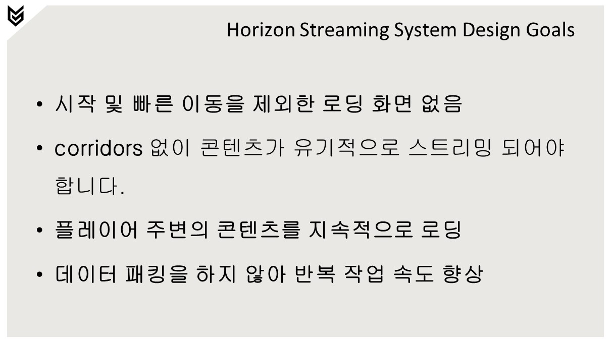 언리얼엔진을 사용하는 MMORPG 개발에 참여하고 있기 때문에 주요 관심사는 스트리밍 로딩의 여러가지 전략에 대한 다양한 관찰이 요구되죠. 이 전 번역글에서는 공간효율적 패키징을 살펴봤습니다. 이번 번역글에서는 호라이즌 포비든 웨스트에서 그들이 중점으로 고민했던 부분과 어떠한 개념으로 월드 스트리밍을 처리했는지 살짝 살펴보는 시간이 될것 같습니다.