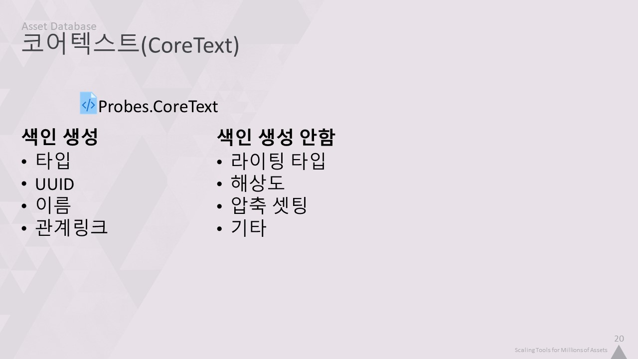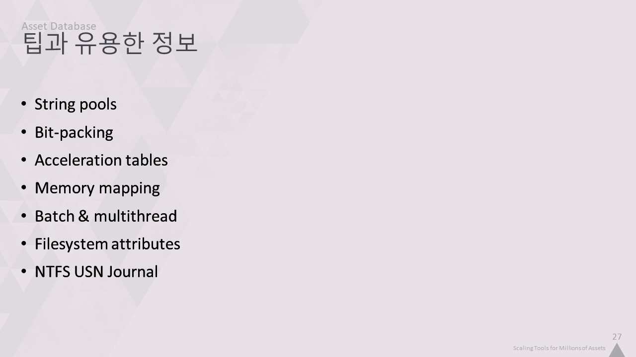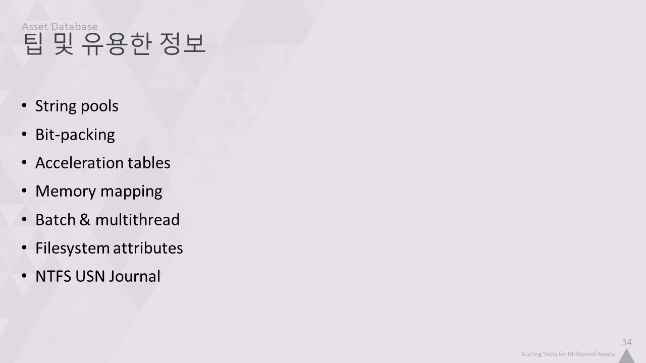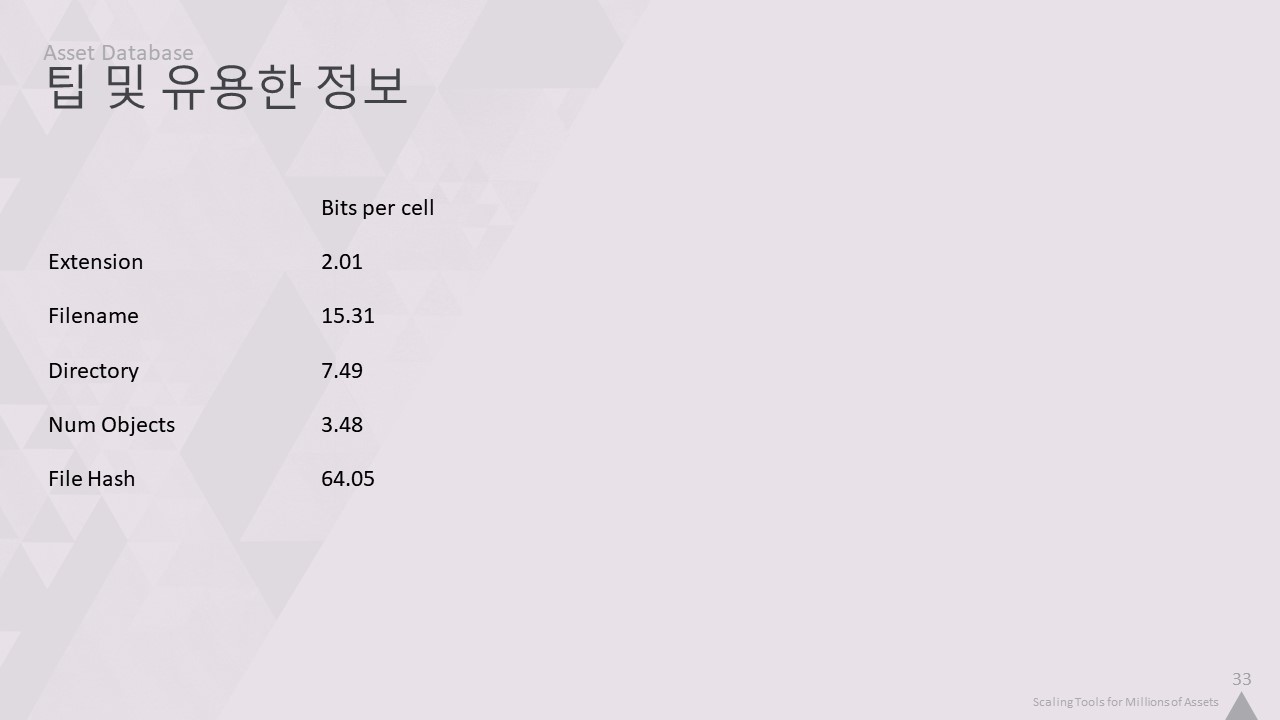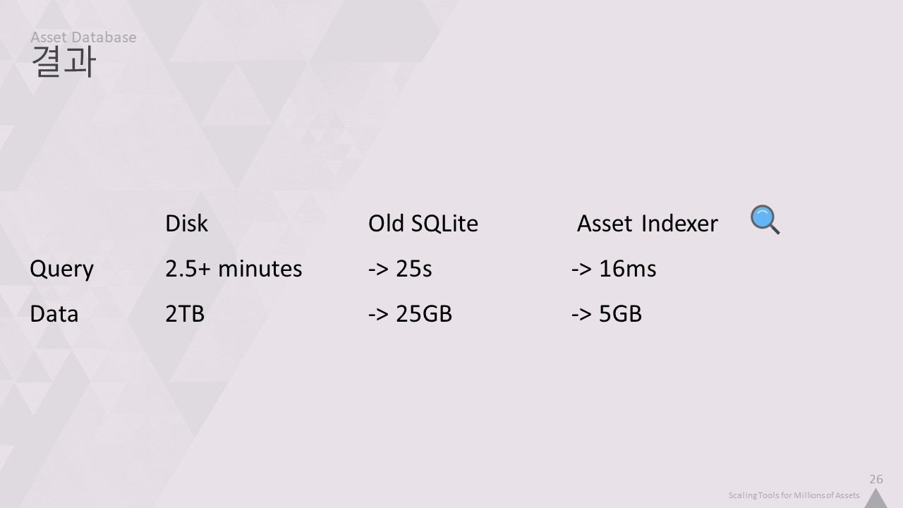 자산 인덱서는 맞춤형 사내 데이터베이스를 사용합니다. 이 강연을 들으면서 알게 되겠지만, 저희는 자체 기술을 만드는 것을 정말 좋아합니다. 따라서 완전히 사용자 정의된 솔루션을 만들면 프로그래머로서 조금 더 행복해집니다. 하지만 특정 데이터의 구조에 대한 지식을 활용하여 기성품보다 더 빠르고 간결하게 만들기 위한 여러 가지 트릭을 적용할 수도 있습니다.