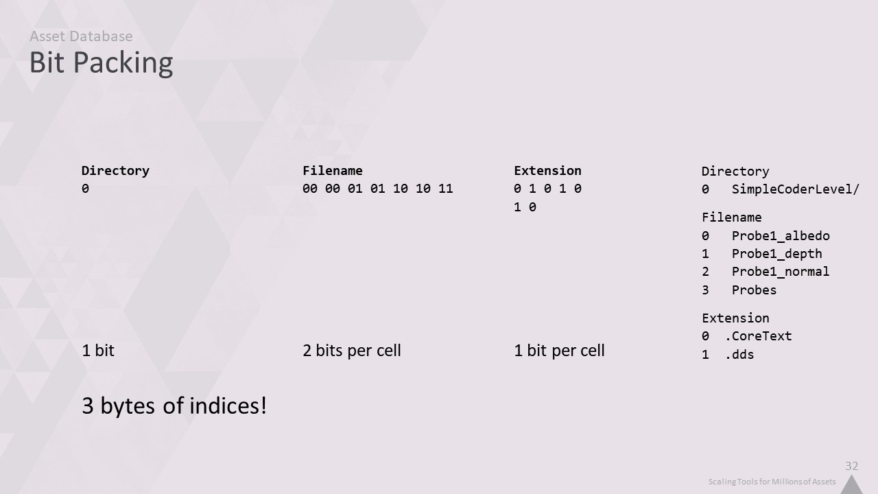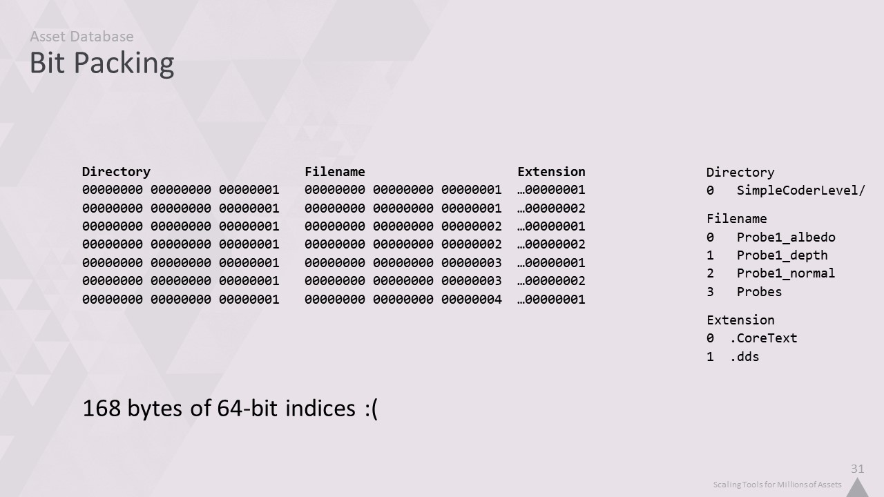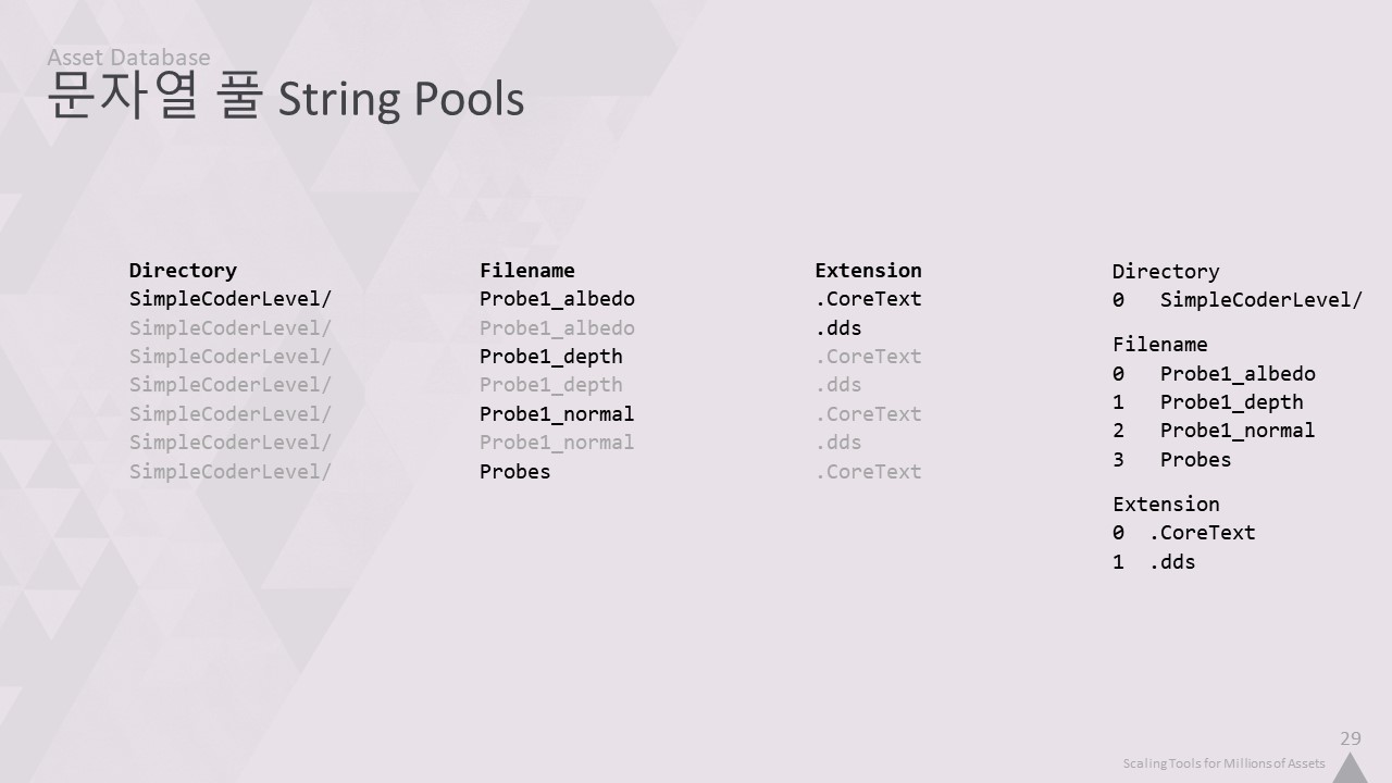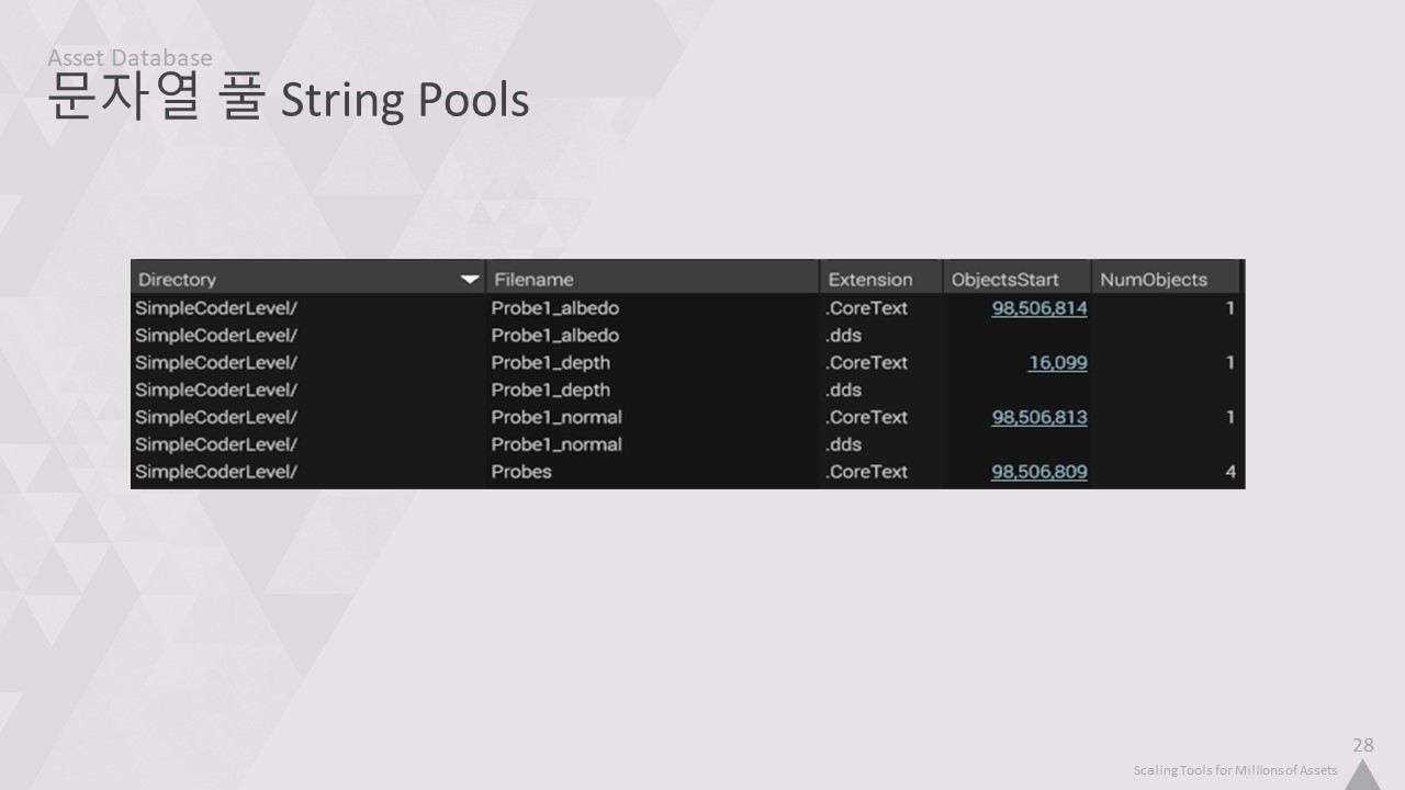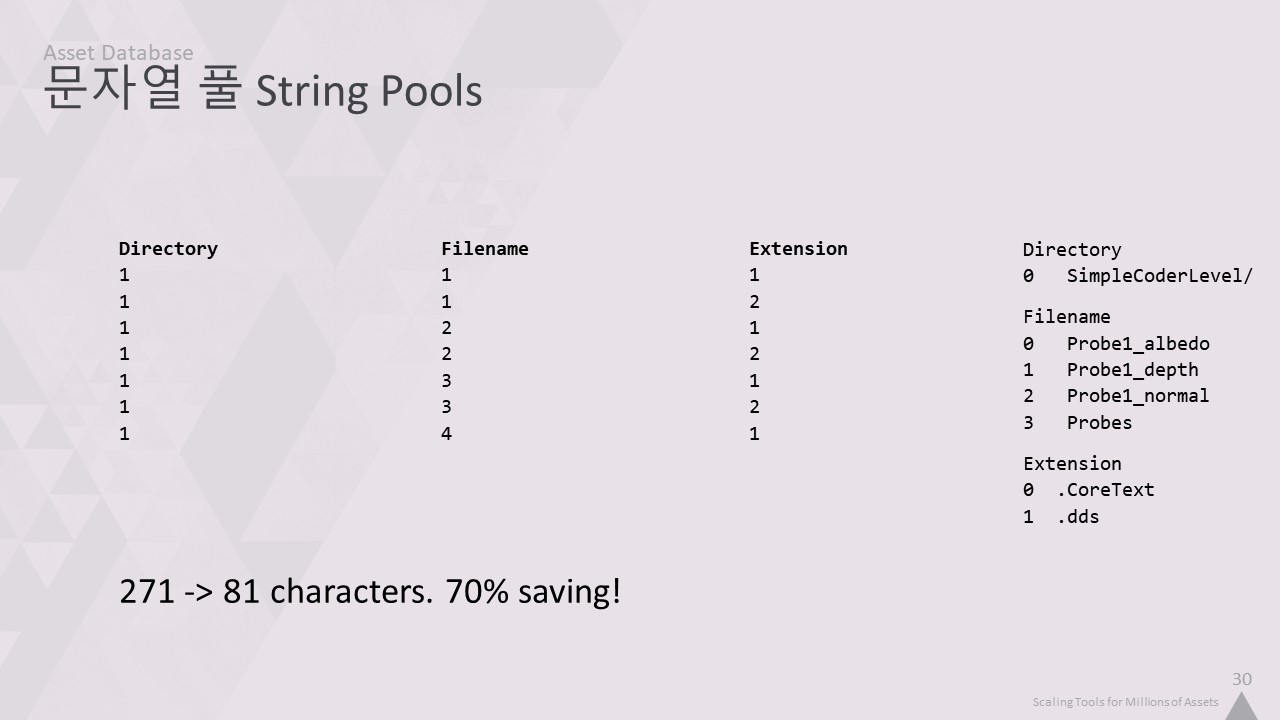 자산 인덱서는 맞춤형 사내 데이터베이스를 사용합니다. 이 강연을 들으면서 알게 되겠지만, 저희는 자체 기술을 만드는 것을 정말 좋아합니다. 따라서 완전히 사용자 정의된 솔루션을 만들면 프로그래머로서 조금 더 행복해집니다. 하지만 특정 데이터의 구조에 대한 지식을 활용하여 기성품보다 더 빠르고 간결하게 만들기 위한 여러 가지 트릭을 적용할 수도 있습니다.