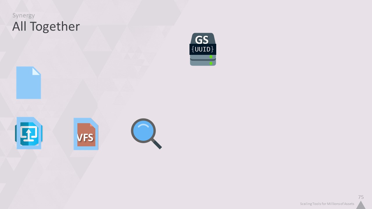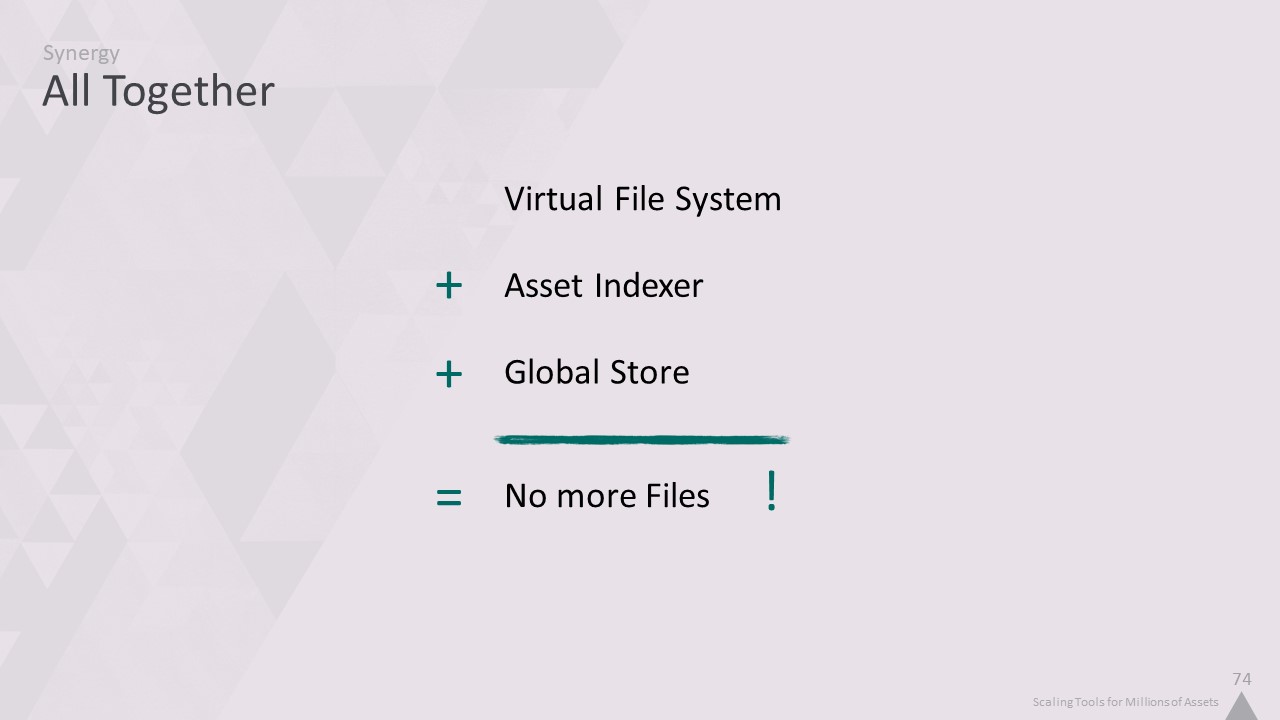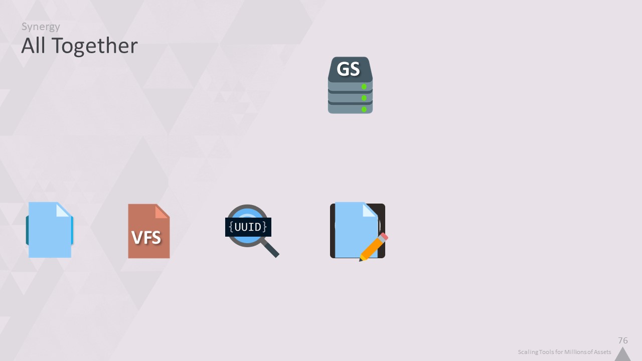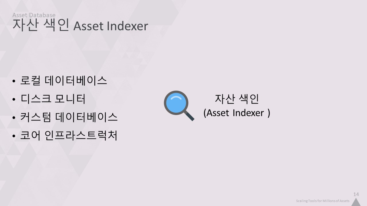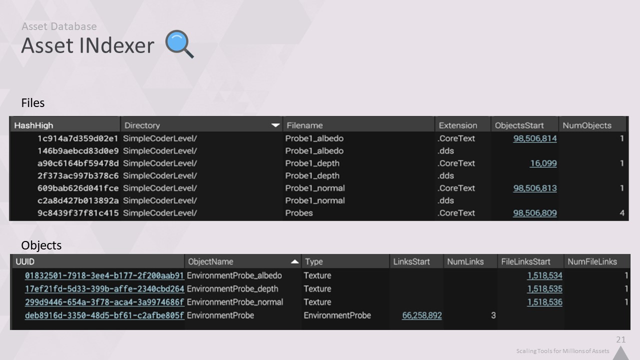 그래서 '자산 인덱서'를 만들었습니다. 이름에서 알 수 있듯이, 1억 개가 넘는 모든 개체에 대한 인덱스를 제공하고 파일을 열지 않고도 콘텐츠를 추론할 수 있는 로컬 데이터베이스입니다.