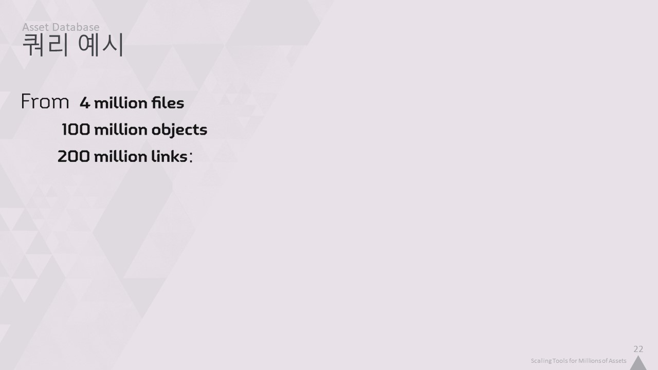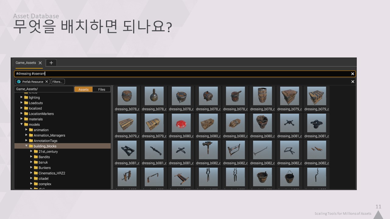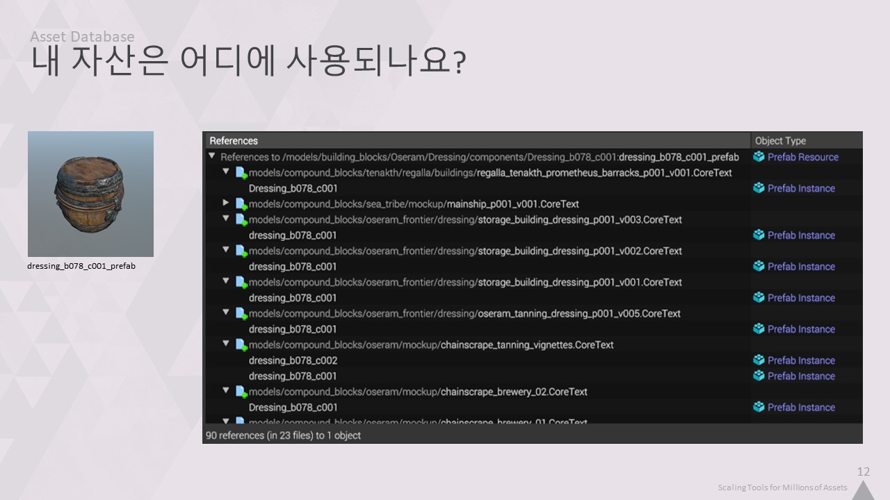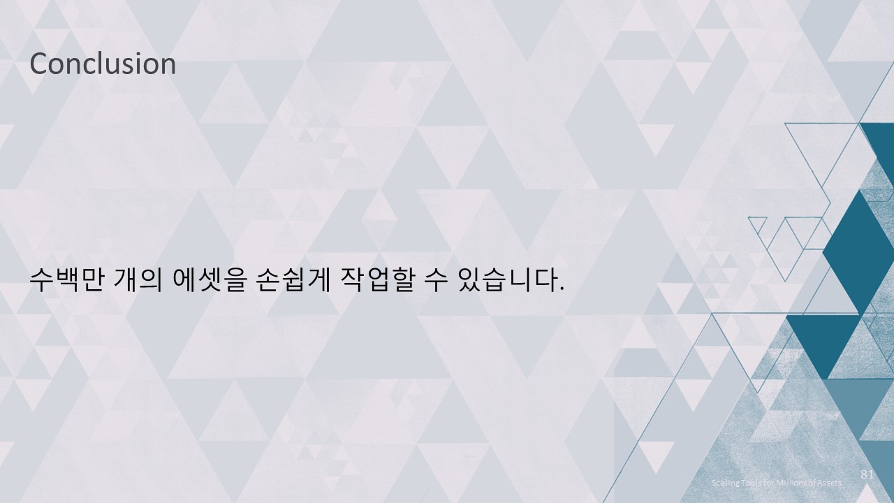 이번 강연에서는 저희 툴링의 핵심 인프라를 개선하여 4백만 개의 에셋을 손쉽게 작업할 수 있도록 개선한 방법을 설명하겠습니다.
