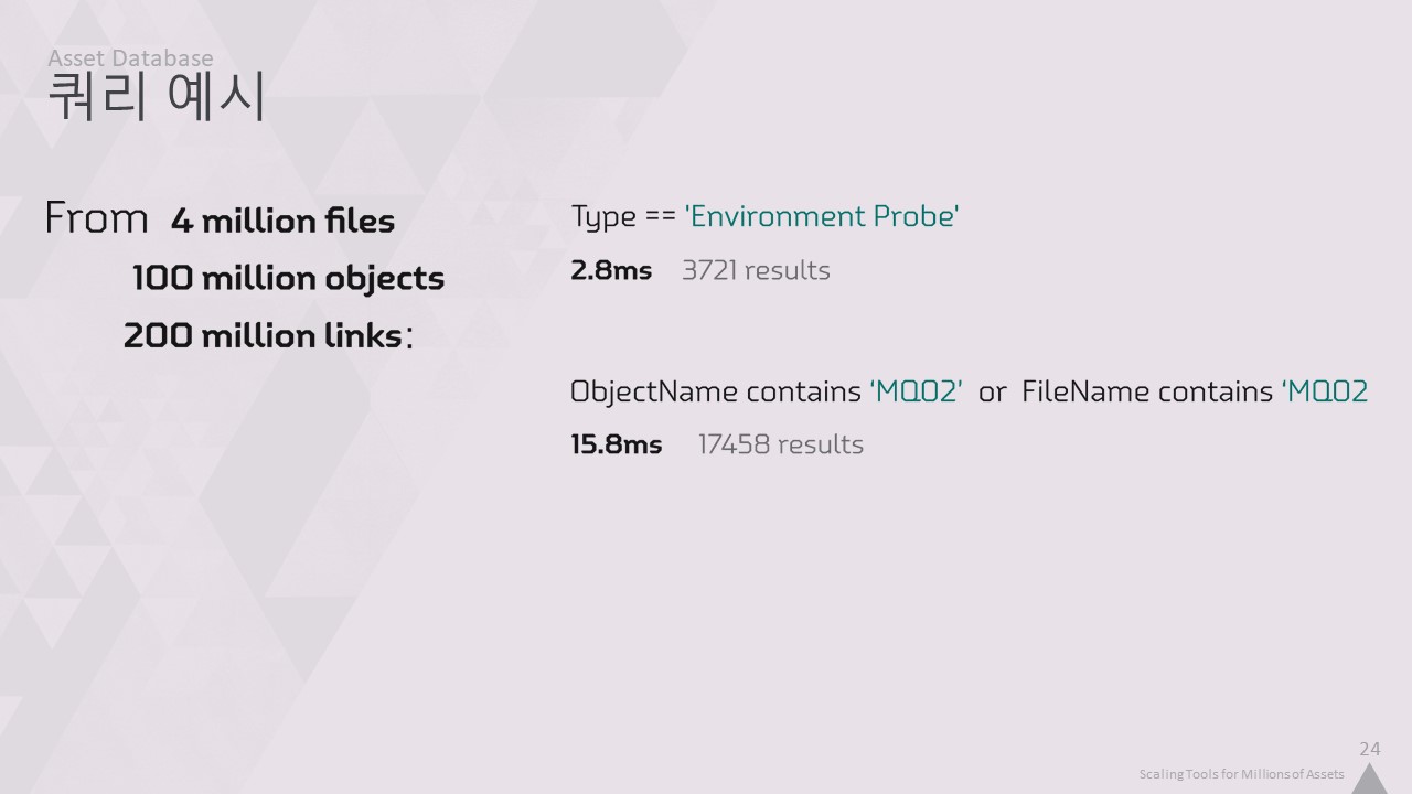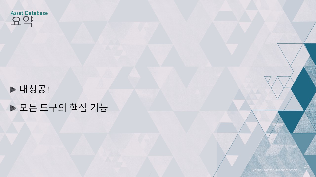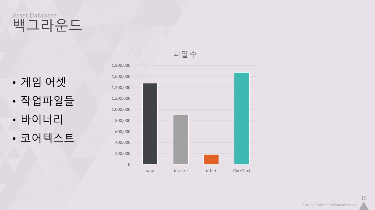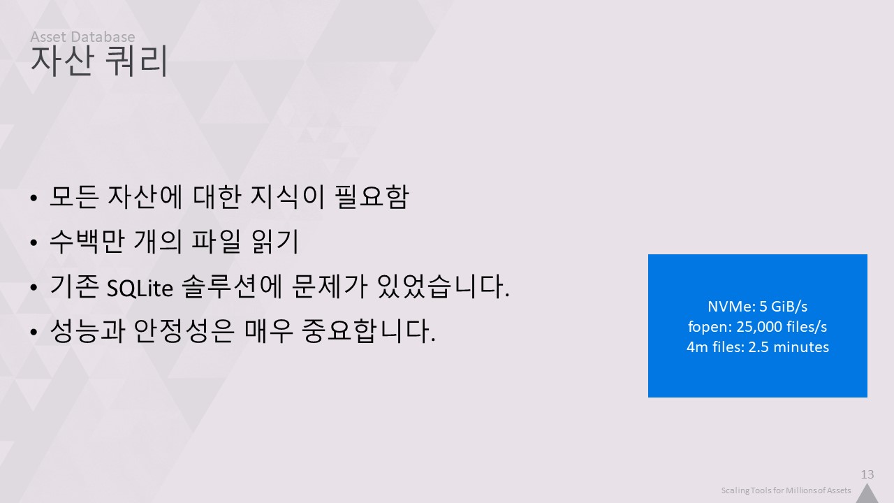 이번 강연에서는 저희 툴링의 핵심 인프라를 개선하여 4백만 개의 에셋을 손쉽게 작업할 수 있도록 개선한 방법을 설명하겠습니다.