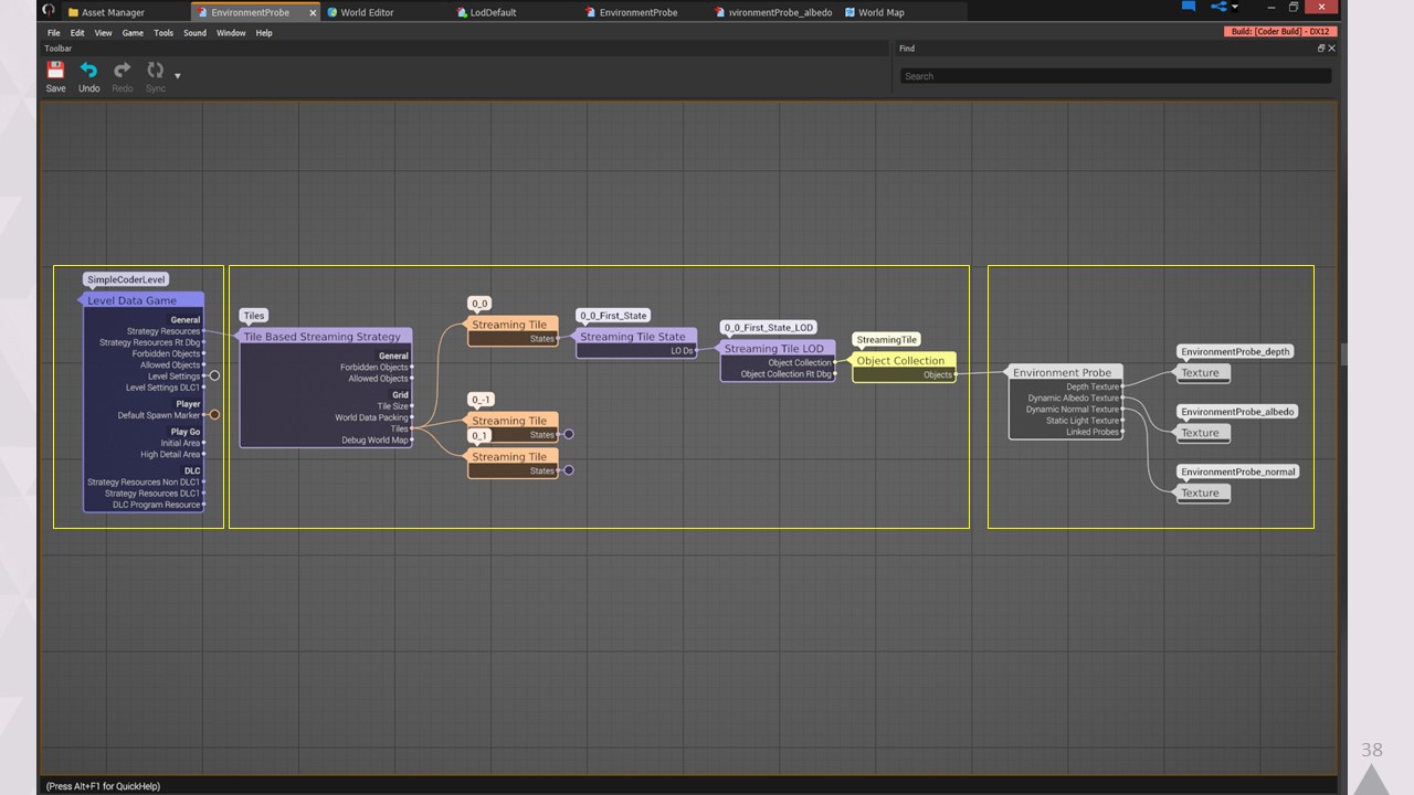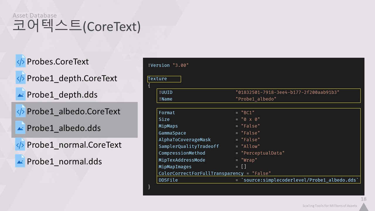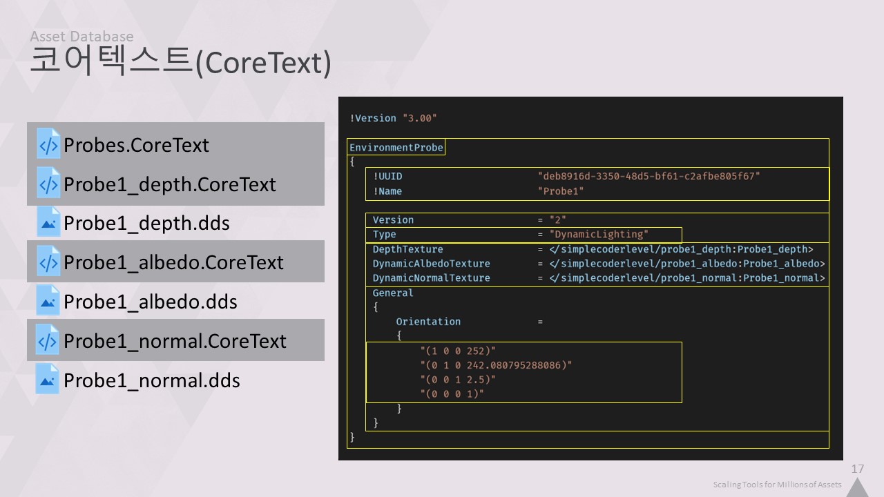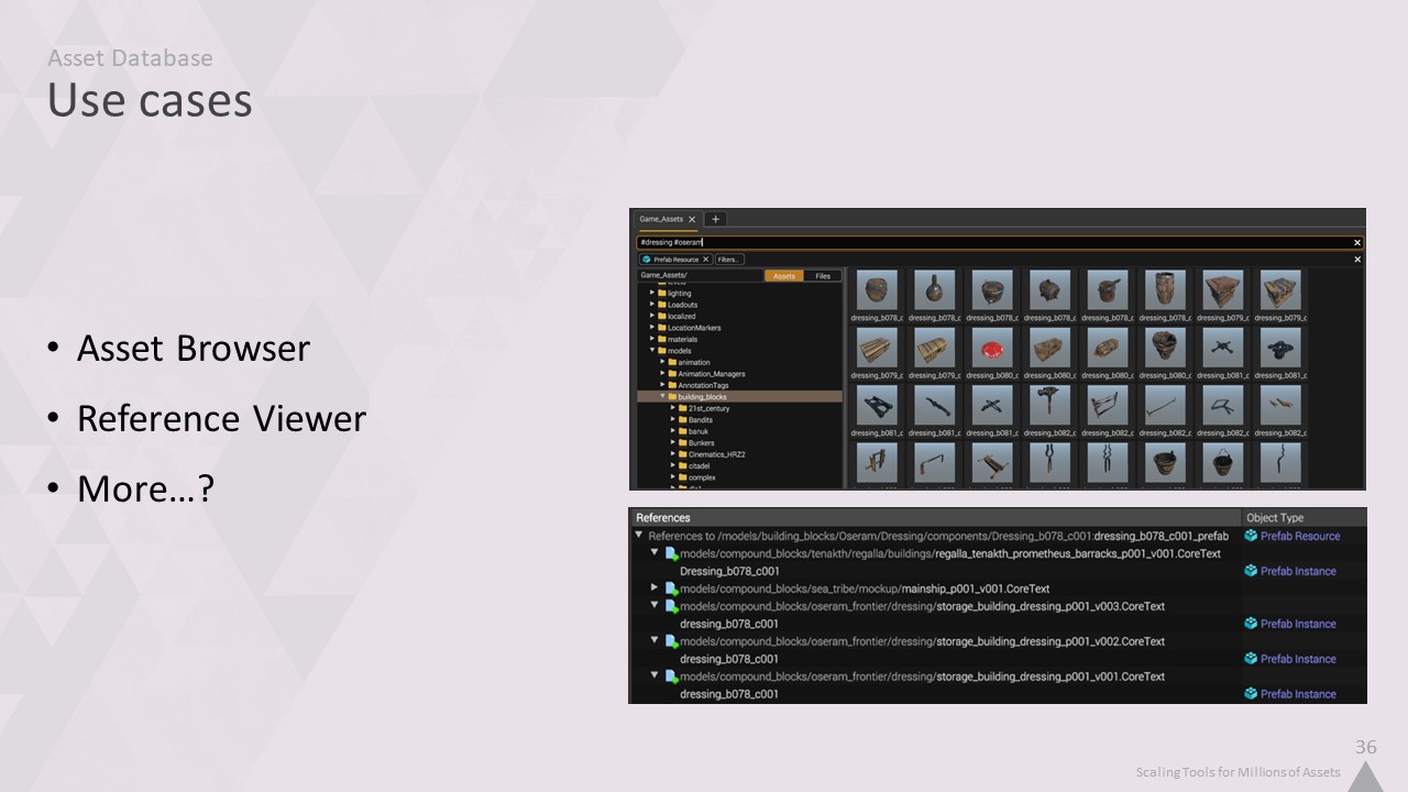 이것은 모든 도구가 실행되는 핵심 데이터베이스가 되었습니다. 파일, 객체 또는 객체 간의 연결에 대해 알고자 하는 모든 도구는 이 데이터베이스에 요청합니다. 여기에는 에디터, DCC 패키지, 파이썬 스크립트, 심지어 게임 자체도 포함됩니다.