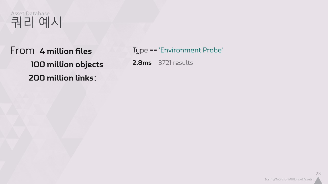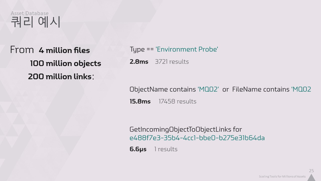 다음은 모든 자산에 대한 지식이 있어야만 확실한 답변을 제공할 수 있는 쿼리의 두 가지 예입니다. 수백만 개의 파일을 매번 읽어내어 원하는 개체를 찾는 것은 불가능합니다.