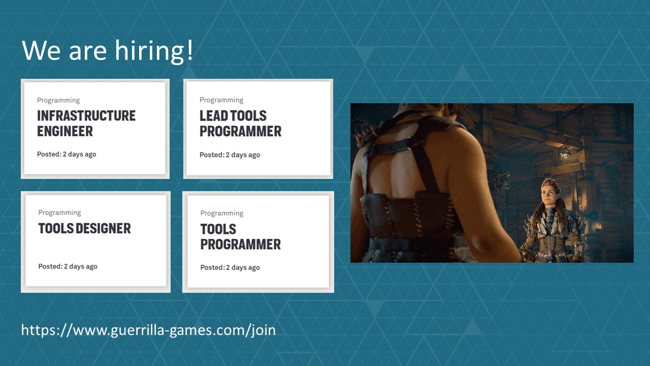인프라 팀의 일원으로 호라이즌 포비든 웨스트의 소스 컨트롤, 빌드 시스템, 패키징 및 기타 툴 관련 작업을 담당했습니다.