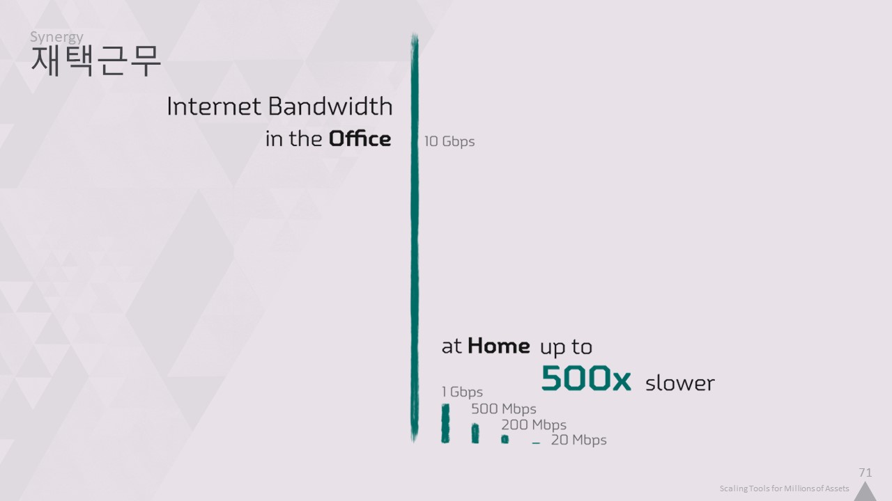 우리는 완전한 워크스테이션을 집으로 보내기로 결정했기 때문에 최악의 경우 20Mbps 연결을 통해 작업하는 사람도 있었습니다.