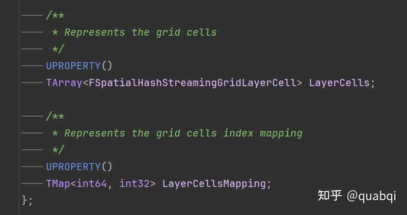 월드 파티션은 내부적으로 이러한 방식으로 공간을 관리합니다. UE5 에는 월드 파티션 외에도 스마트 오브젝트, 존 그래프 등 이런 식으로 공간을 관리하는 모듈이 많이 있습니다. 특히 HierarchicalGrid2D.h를 볼 수 있는데, 이는 일반 컨테이너로 프로젝트를 직접 재사용할 수도 있습니다. 그리고 “월드파티션 런타임 스페이셜 해시”의 월드파티션 구현은 아래 그림과 같이 WorldPartitionRuntimeSpatialHash.h의 FSpatialHashStreamingGridLevel에 있습니다: