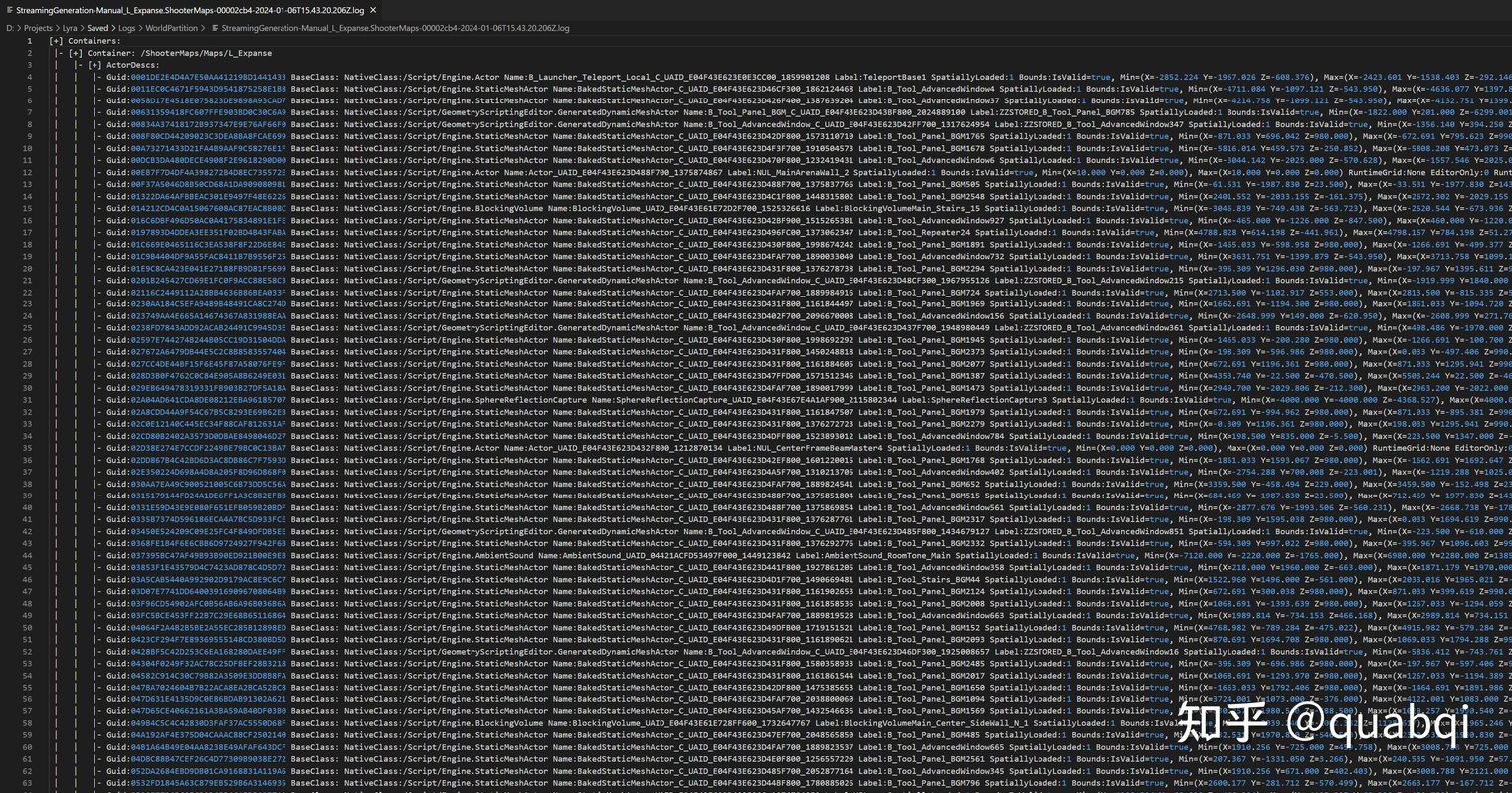 이 파일은 월드파티션의 버그와 다양한 로딩 문제를 검사하는 데도 유용합니다. 엔진 5.3 버전에서는 wp.Editor.DumpStreamingGenerationLog를 사용하여 결과를 한 번 출력할 수도 있는데, 이 명령은 실행하지 않고도 결과를 출력할 수 있습니다.