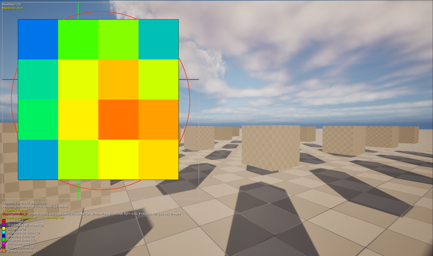 - 셀 스트리밍의 우선순위 히트맵을 보려면 wp.Runtime.ShowRuntimeSpatialHashCellStreamingPriority 1 명령을 사용합니다.