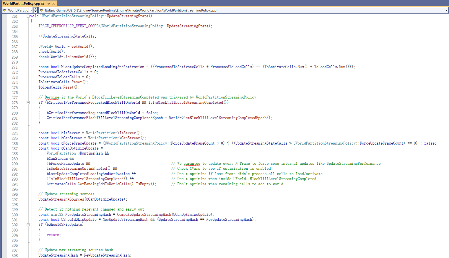 월드 파티션은 기본적으로 스트리밍 최적화가 설정되어 있으며, 모든 프레임이 스트리밍 상태를 업데이트하는 것은 아니며, 다음 구성을 통해 최적화 전략을 조정할 수 있습니다: