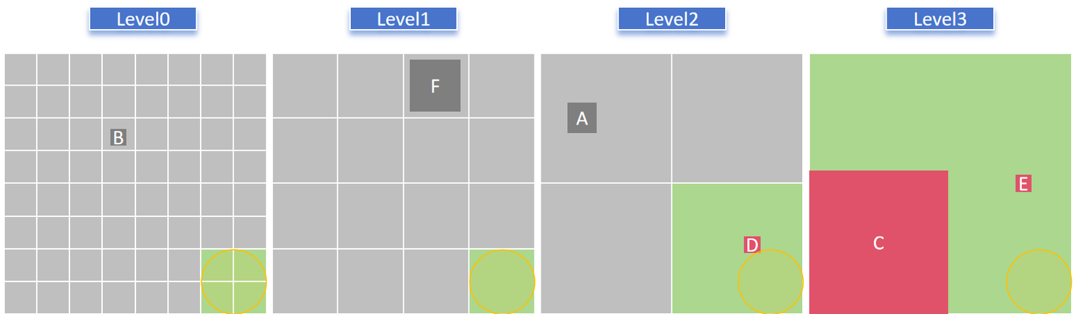 월드 파티셔닝은 가장 낮은 그리드 레벨에서 시작하여 오브젝트를 해당 영역을 거의 포괄하는 셀로 분할합니다.