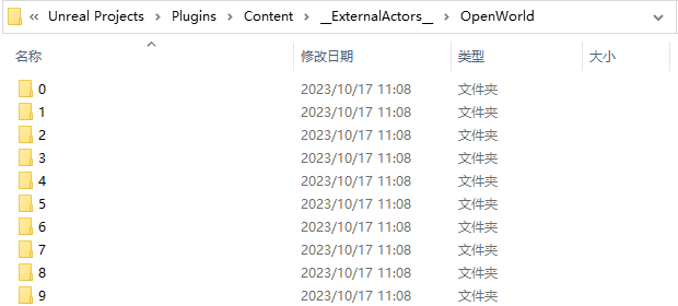 이 파일은 프로젝트 Content 디렉터리의 ExternalActors 및 ExternalObjects 폴더의 해당 맵 경로 아래에 저장되며, 아래 그림은 OpenWorld라는 이름의 맵에 있는 모든 액터를 나타냅니다: