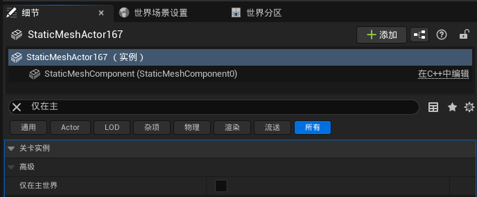 레벨 인스턴스의 액터에는 메인 월드 전용 옵션이 추가로 있는데, 체크하면 이 액터는 레벨 인스턴스 맵이 열렸을 때만 로드되며, 다른 맵에서 레벨 인스턴스로 로드할 때는 로드되지 않습니다: