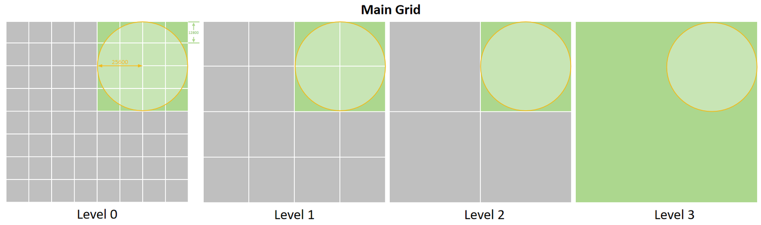 위 그림에서는 4방향 파티션만 보이지만, 실제로 UE의 월드 파티션은 스트리밍에 스파스 쿼드트리 방식을 사용하며 그리드 레벨도 여러개 이므로 레벨0만 표시됩니다: