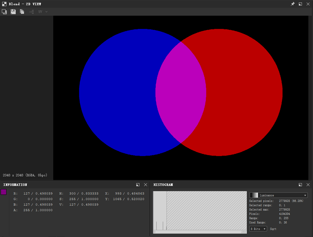 하지만 Color 를 사용 하여 Blend 노드를 확인 하면 가운데 부분이 50퍼센트 감소한 원색상의 파란색과 50퍼센트 감소한 원색상 빨간색을 절반씩 혼합 한 색상이 나올 것이다.