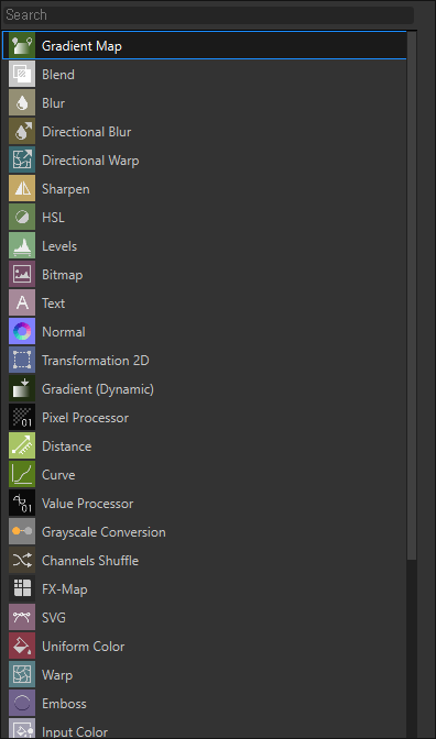 기본적으로 Atomic node 가 나타나며 Search 를 사용 하여 SD 에서 제공 하는 모든 Node(Filter,Material,Function,Bitmap…)를 호출 할 수 있다.