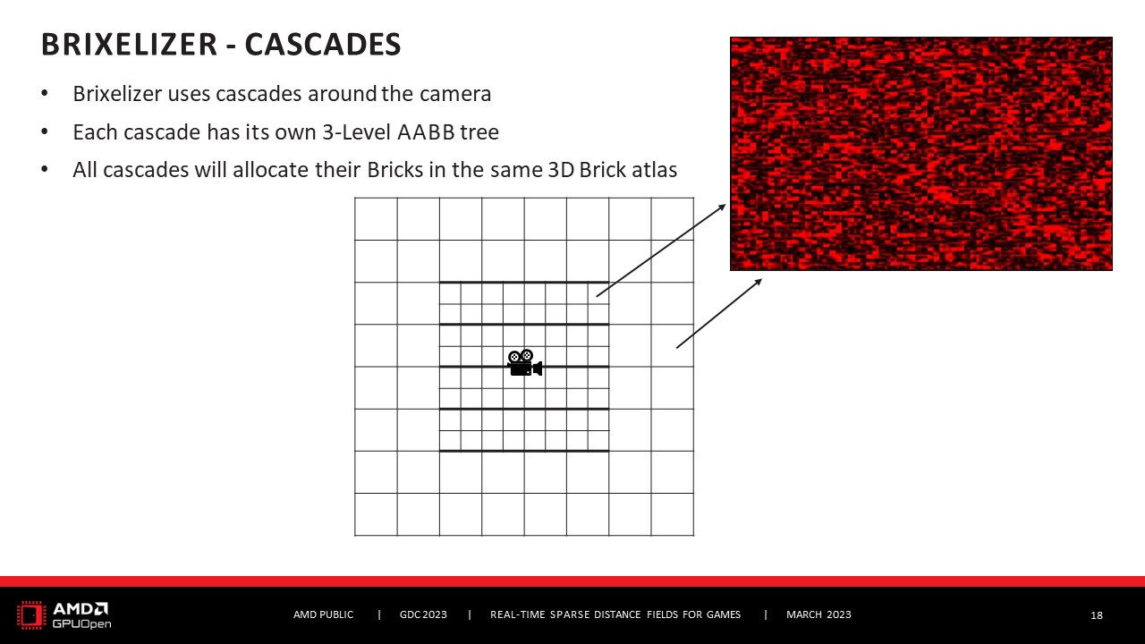 Well, Brixelizer uses cascades, and they are typically centered around camera. And this is to account for nearby objects and far-away objects. So object that are really close to a camera typically need a higher resolution than objects that are further away. And this is also one optimization, because this way we save on resolution for objects that don’t need it, because they’re just so far away. Each cascade has it’s own 3-level AABB tree, but all cascades will point to the same 3D Brick atlas. So the atlas is shared among all the cascades.