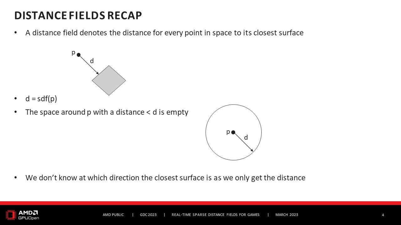 Let’s start with the recap.So What are distance field?Well, a distance field is a function that gives you the distance for every point in space to its closet surface.So you can write that as d=sdf(P).