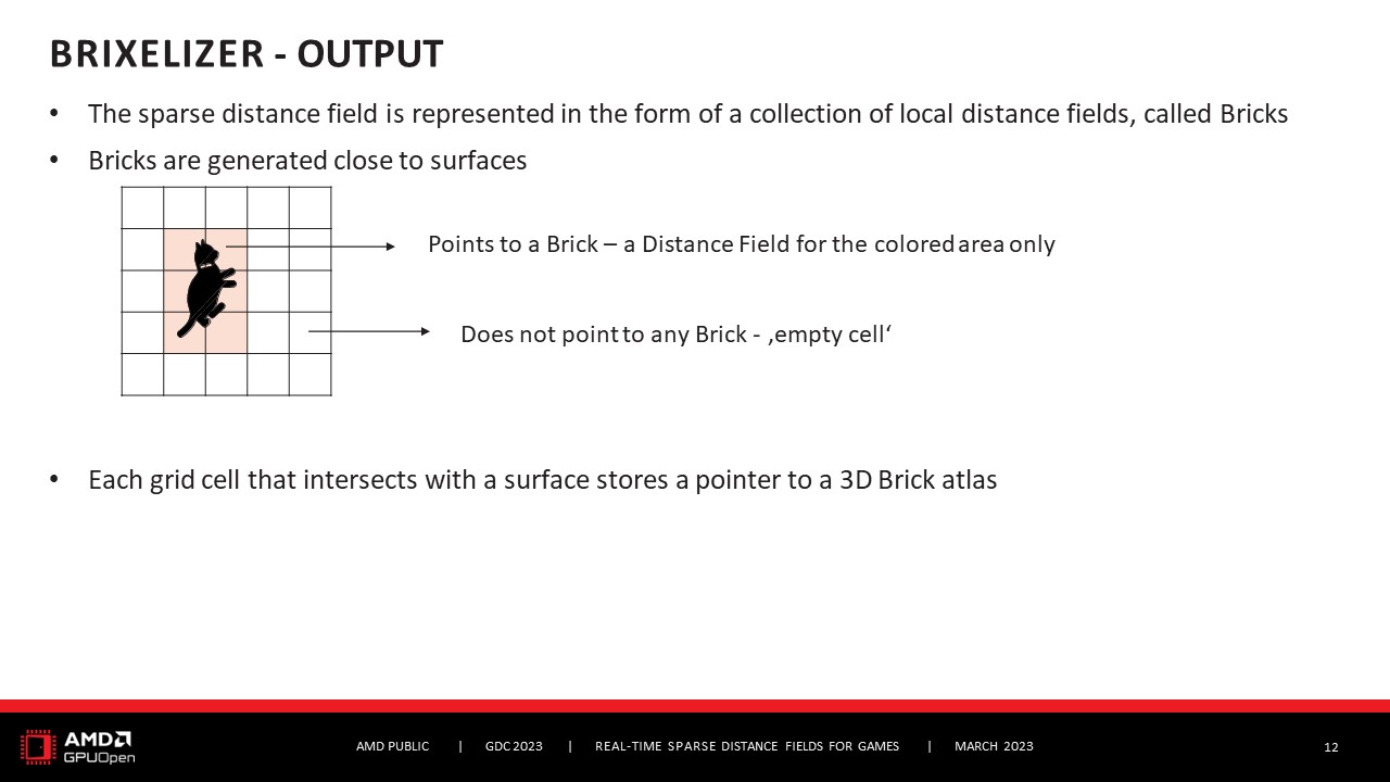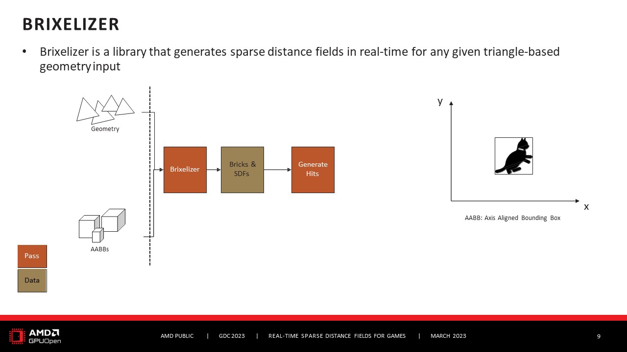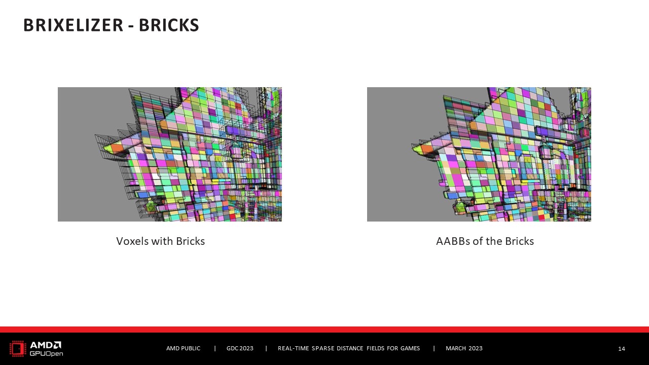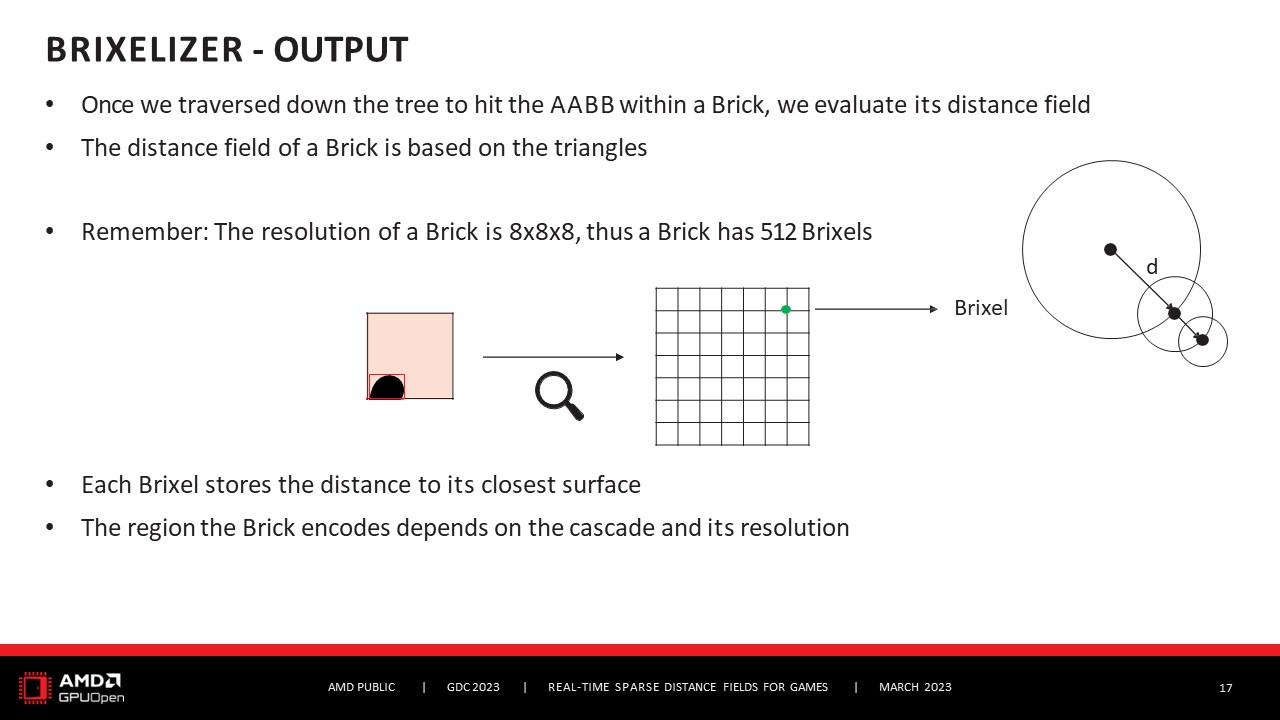 Now let’s talk about Brixelizer.Bixelizer is AMD’s solution to generate sparse distance fields in real-time for any given triangle-based geometry input.So you have the geometry input in a triangle representation. So typically you have a vertex buffer, index buffer. You also need the transform information so that we know where the geometry is in your world. Then additionally to that, you also need to provide the axis-aligned bounding box, in short, AABB. This information will be taken by Brixelizer, and then Brixelizer will do its magic and generate the sparse distance field, that you then can in turn use to generate the ray hit point with the scene. So in this slide, you notice I say Bricks and sparse distance fields. And what Bricks mean, I will explain very shortly.