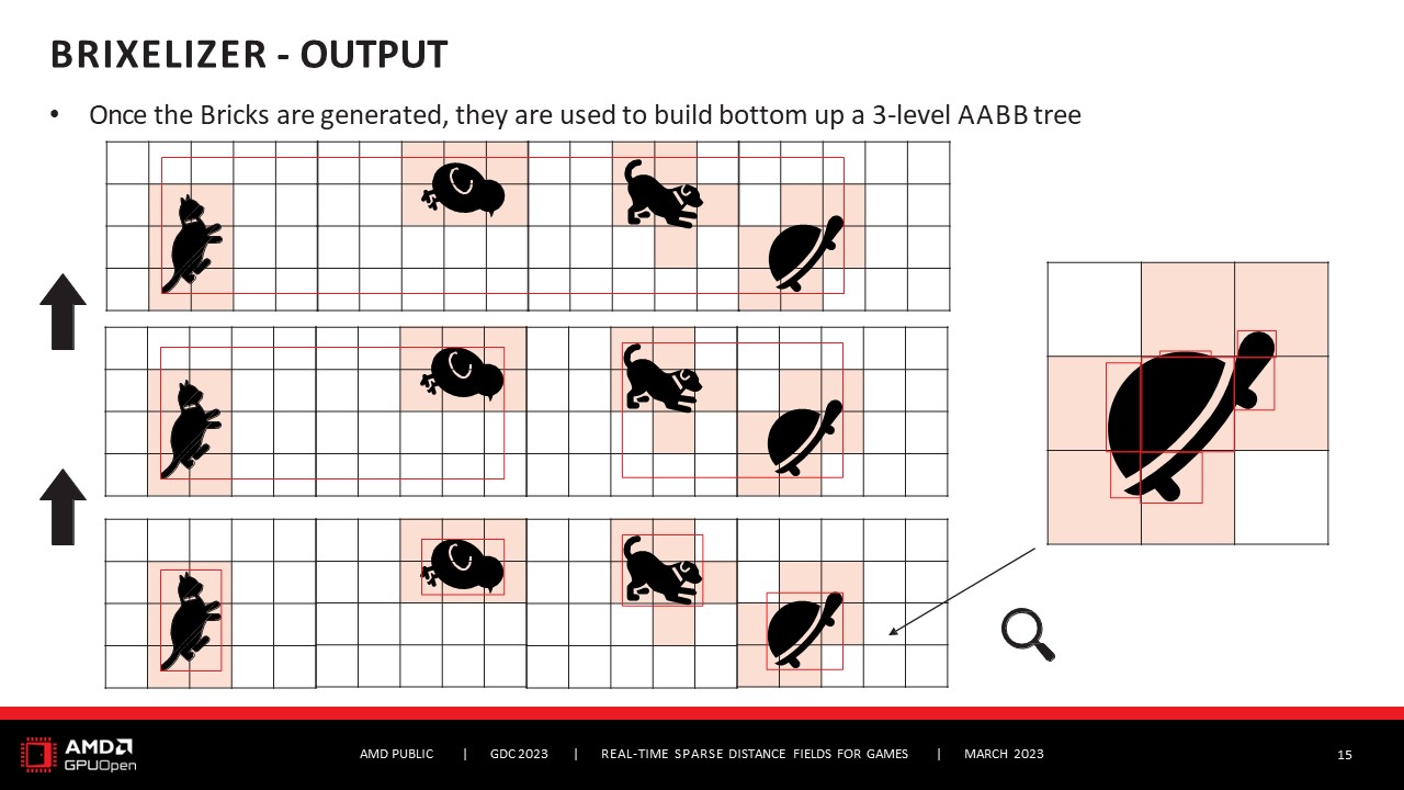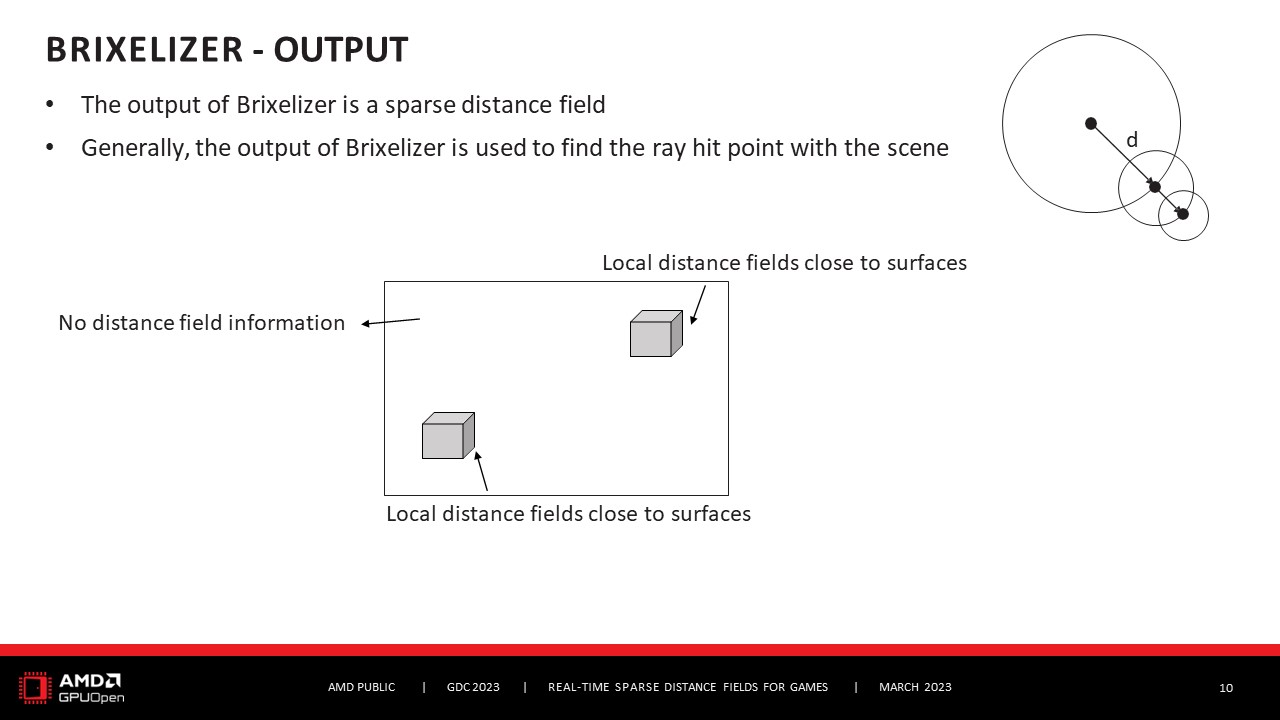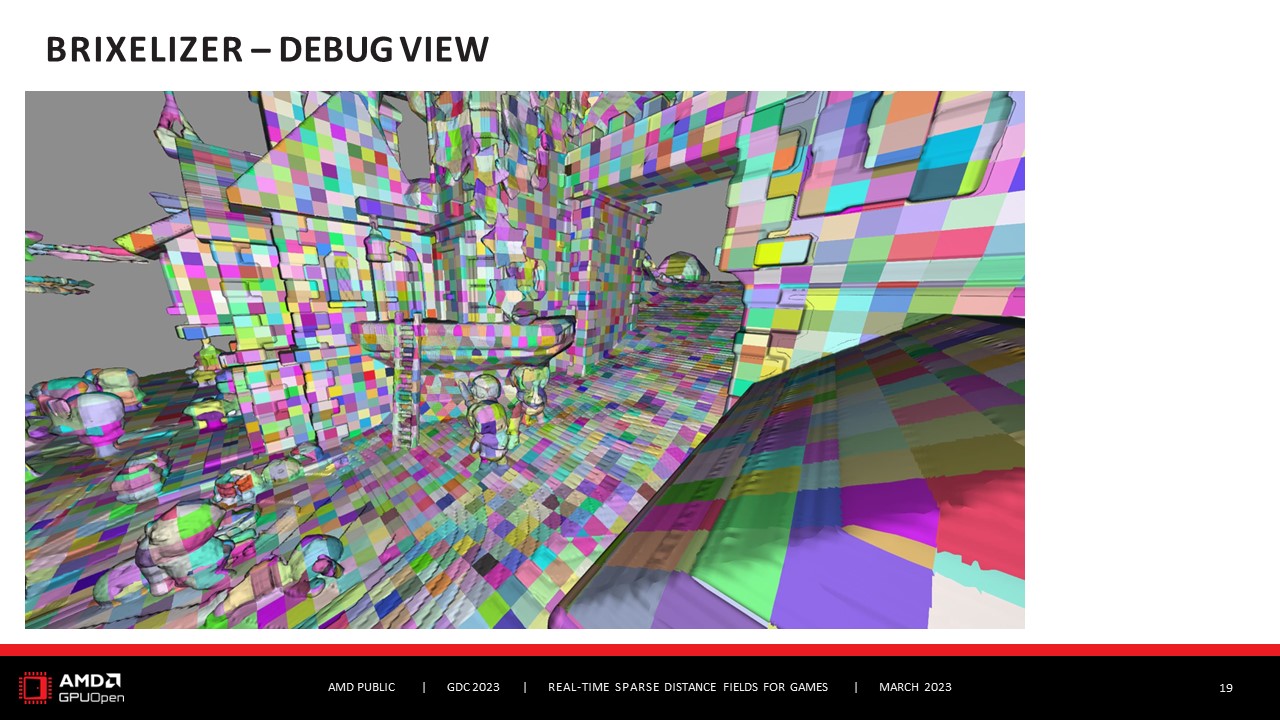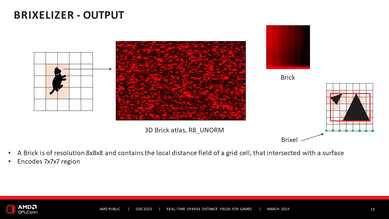 Now let’s talk about Brixelizer.Bixelizer is AMD’s solution to generate sparse distance fields in real-time for any given triangle-based geometry input.So you have the geometry input in a triangle representation. So typically you have a vertex buffer, index buffer. You also need the transform information so that we know where the geometry is in your world. Then additionally to that, you also need to provide the axis-aligned bounding box, in short, AABB. This information will be taken by Brixelizer, and then Brixelizer will do its magic and generate the sparse distance field, that you then can in turn use to generate the ray hit point with the scene. So in this slide, you notice I say Bricks and sparse distance fields. And what Bricks mean, I will explain very shortly.