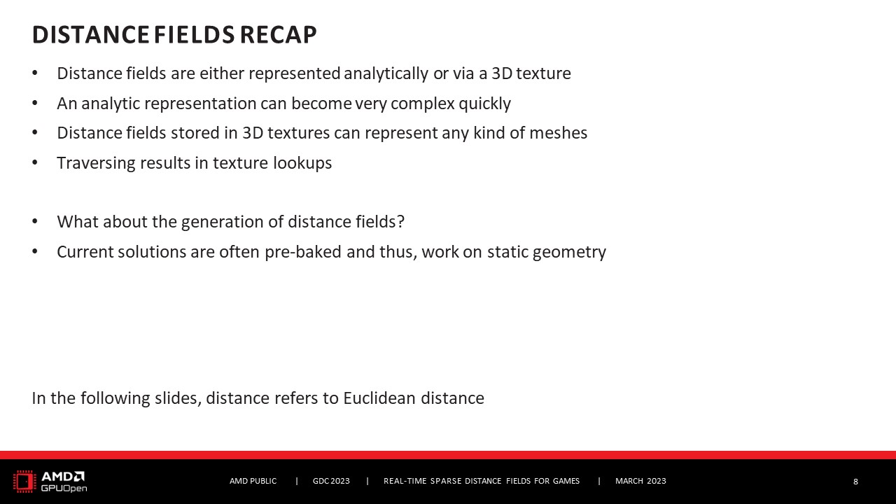 Typically, it’s done either analytically or via 3D texture. If it’s an analytic representation, it can become very complex very quickly, depending on the scene.And then when you evaluate the distance field, so you do the traversing and you want to get the distance for the point, it might involve a lot of computations, while with a 3D texture, the generation of the 3D texture can be quite expensive, but as soon as we have the 3D texture and you do traversal, then it’s just a texture look up.And then it also doesn’t matter what kind of meshes you encode in the 3D texture. This only plays a role when generating the 3D texture.So how do you do this generation? So current solutions are often actually pre-baked, So it’s offline, and thus they only work on static geometry.And here is where our solution comes in, because it’s real-time.This also means that it can take dynamic geometry into account. And before I go on, I’d like to get rid of any confusion. If I refer to distance in the following, I always mean Euclidean distance.