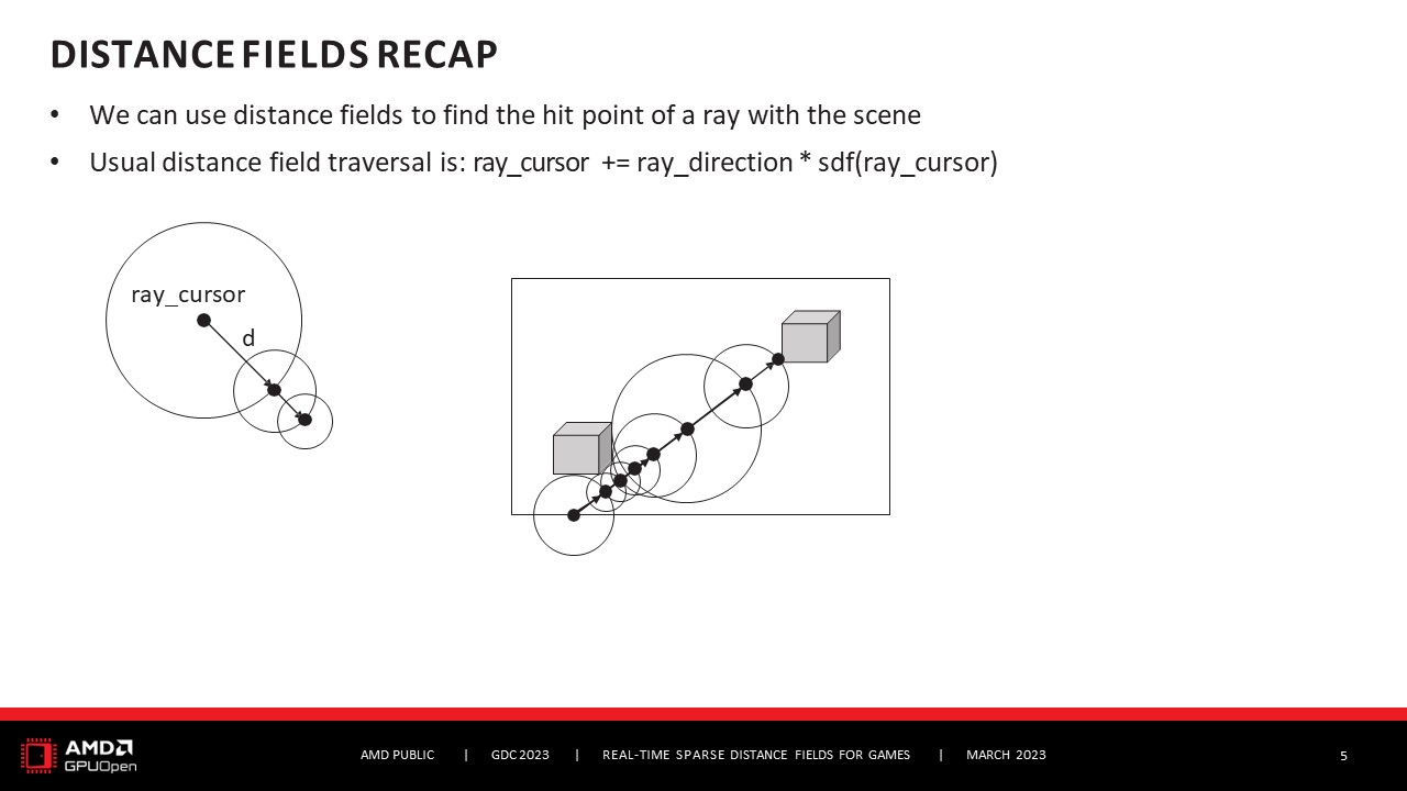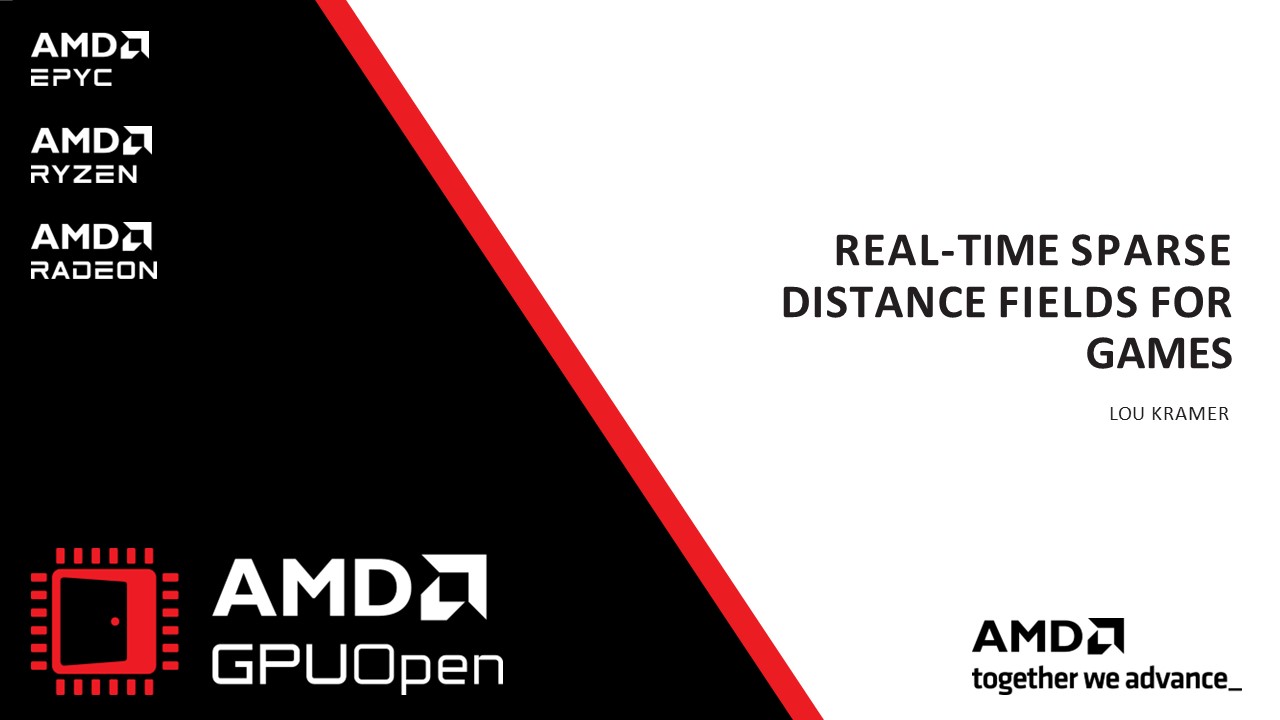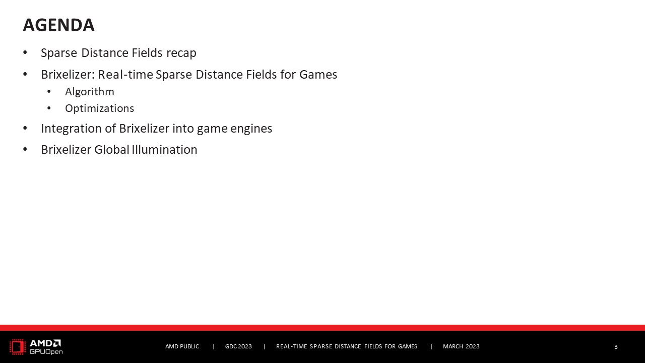 And Now to the talk itself. In the beginning, I will quickly recap what sparse distance field are, Just to make sure that everyone is on the same page. And then I am very proud to present to you to project, Which is Brixelizer. It is real-time sparse distance field generator for games. I will talk about the algorithm and also about the optimizations that We’ve done to get it into real-time. I will also cover the integration so that you kind of get the feeling of the workload that’s associate with integrating Brixelizer into your game engine. And lastly, I will talk a bit about How you can use Brixelizer into your engine. And one example is to use Brixelizer to compute global illumination. These last section is very future looking because it’s based on a research project at AMD that is not finished yet. But It will give you a quite good idea of What can be done with Brixelizer and also should inspire you to do your own work.