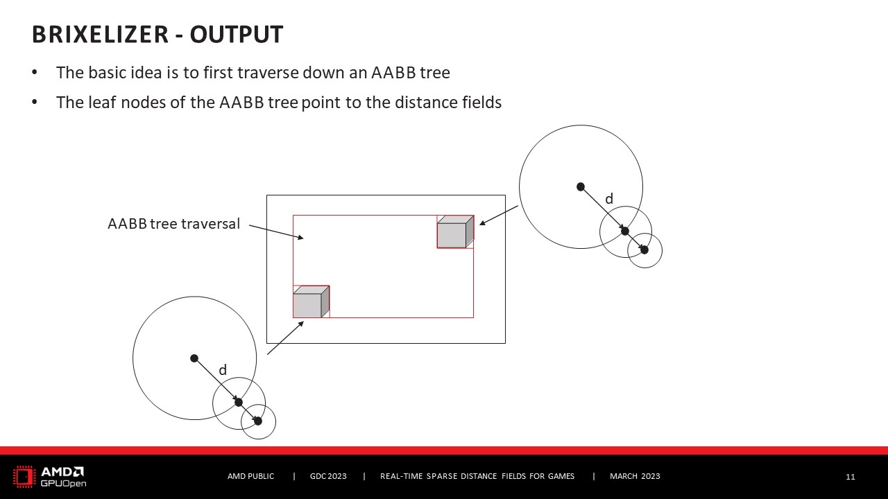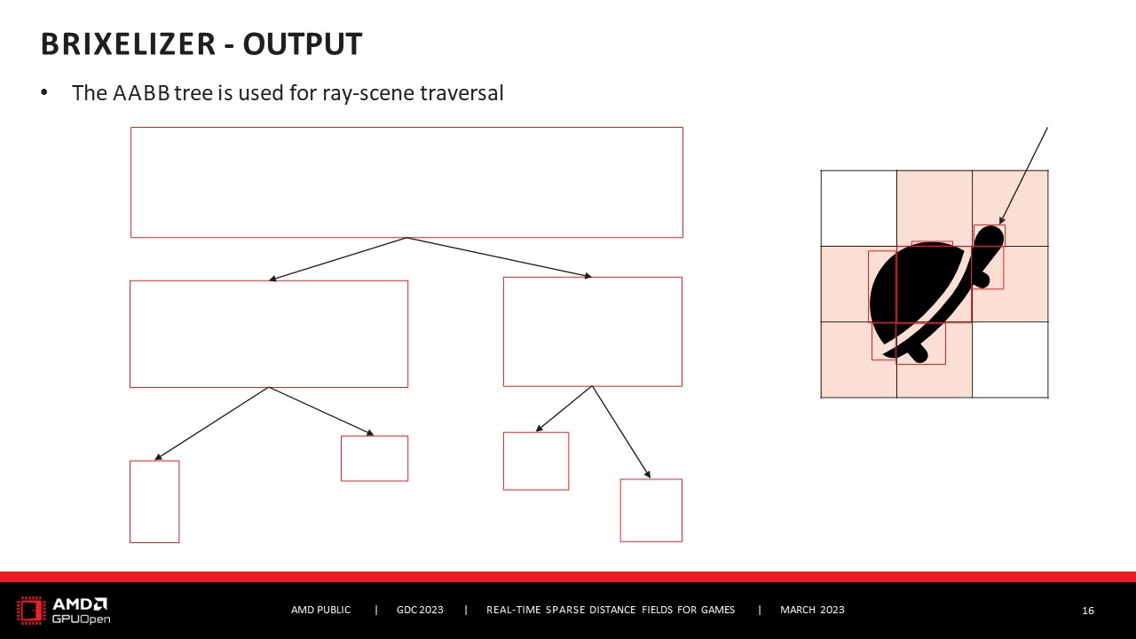 For empty space, Brixelizer will use an AABB tree. So, first, you traverse the AABB tree. And then once you reach the leaf nodes, you swap to traverse the distance fields.