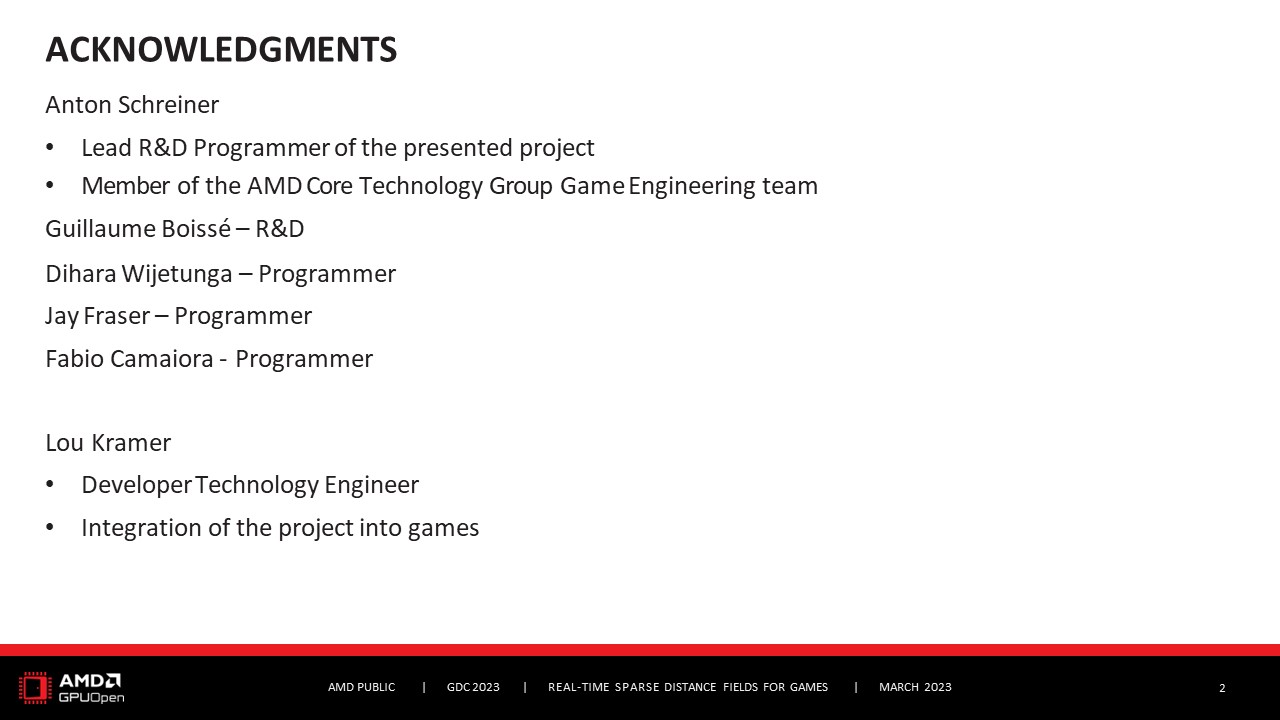 Before I will present to you to the project, I want to take to time to credit the people who are actually behind the project. And, This is first of all Anton Scheriner. He was the lead R&D programmer and He is part of AMD core technology group, Which is in turn part of the AMD game engineering team. Guillaume Boissé, He did some initial R&D work for this project, So He developed a prototype for distance fields that was then taken by Anton to do his own research. Dihara, Jay and Fabio Also played an important role because they took the research work and made of product out of it.And this is also where I come in.