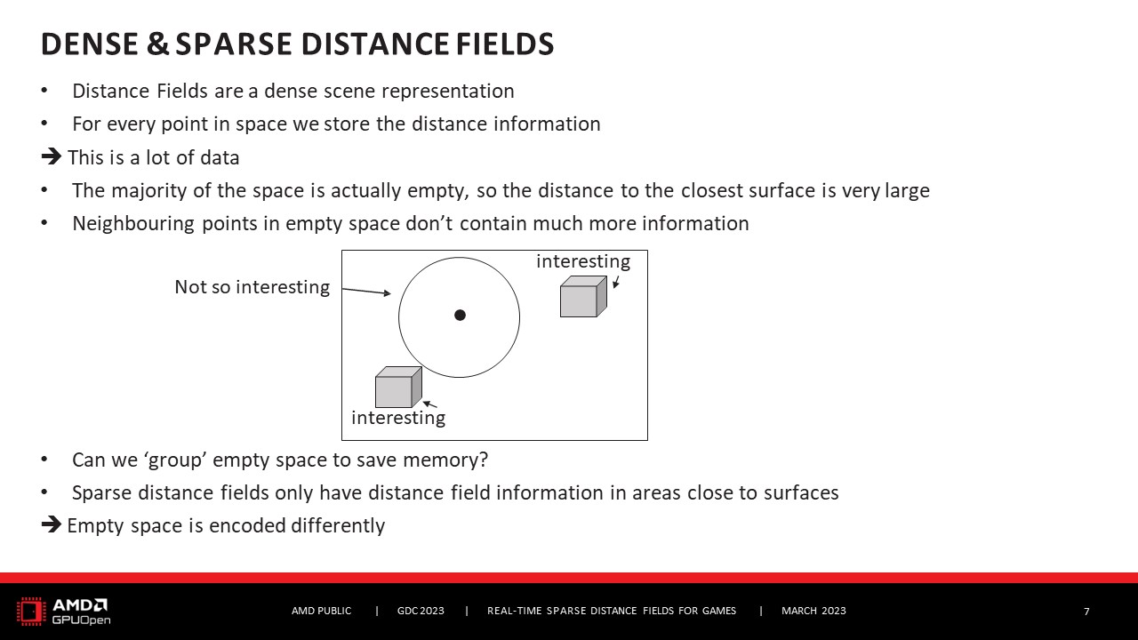 So, What is a sparse distance field?Well, distance fields are a dense scene representation. So, for every point in space, we store the distance information.This is a lot of data, especially if you consider that most of the space is actually empty.So, neighbouring points in empty space have less information compared to neighbouring points close to the surface.So the question arises: can we somehow group empty space to save memory? Because memory is very precious, right?We don’t want to waste it on areas that contain very little information. And this is precisely what sparse distance fields try to solve.So they encode empty space differently and then have the distance field information for space that’s actually interesting for us.How empty space is encoded depends on the sparse distance field. But before We talk about how it’s done in our solution, let’s talk about how distance field themselves are represented.