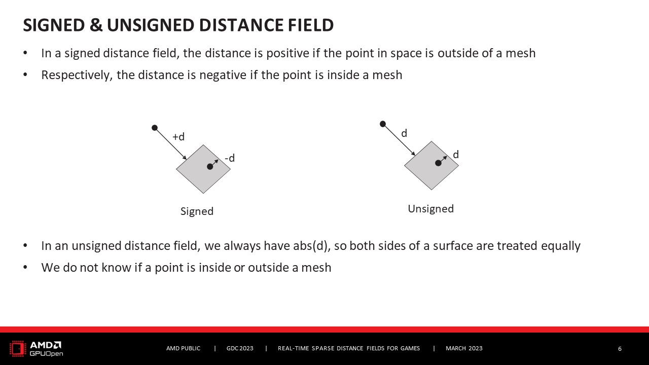 So, We don’t know if your point is inside or outside the mesh.Generally generating a signed distance field is more expensive because we also encode more information in this distance field.But it’s also generally less robust, especially if you don’t know what type of content you’re dealing with.