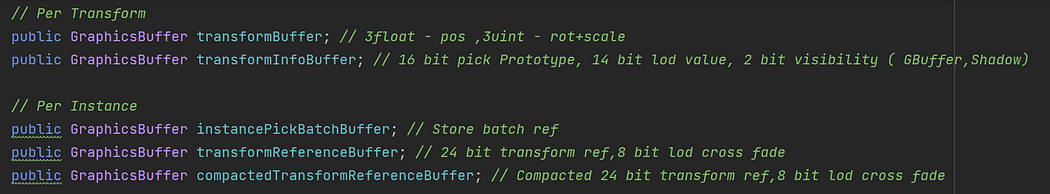 스케일링 및 회전 외에도 트랜스폼 인덱스 선택 및 LOD 크로스 페이드 값과 같은 다른 파라미터도 패킹되어 메모리 사용량을 더욱 최적화합니다. 최종 버퍼와 그 패킹 설명은 다음과 같습니다: