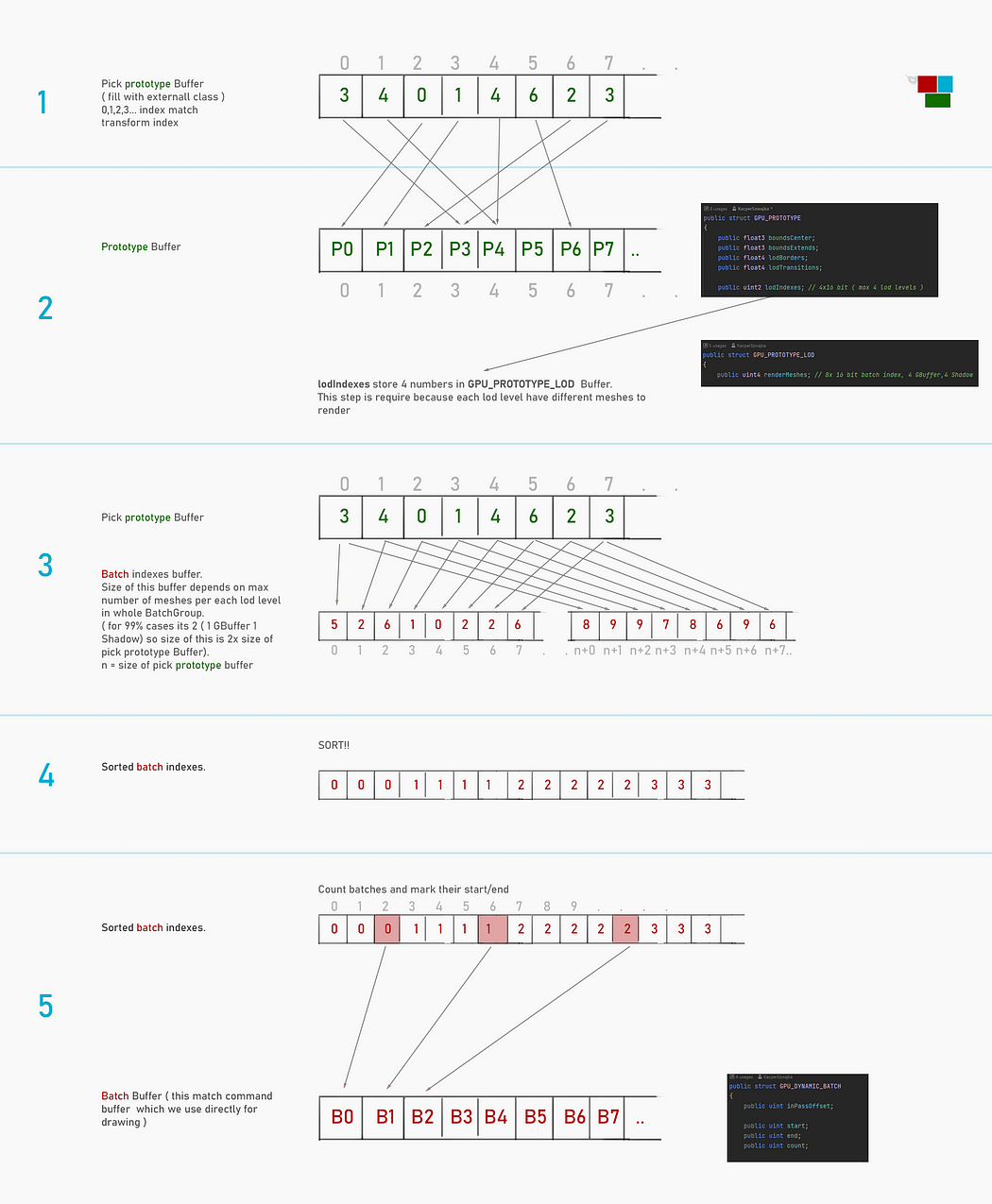 정렬이 수행될 때 각 배치 수를 계산하기 위해 몇 가지 단계를 수행한 다음 이 데이터를 하나의 큰 명령 버퍼로 변환하여 IndirectDrawingCall에 사용합니다.