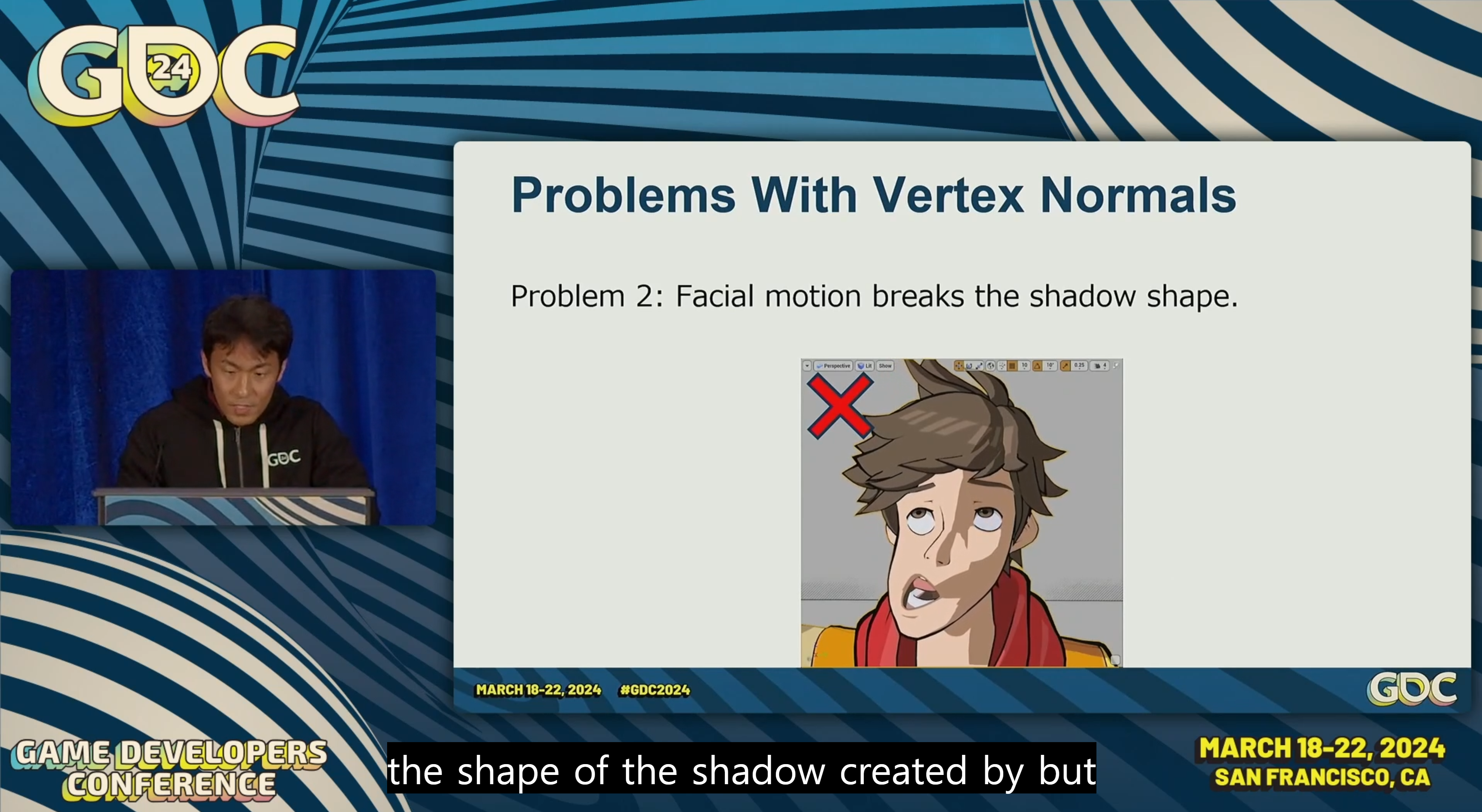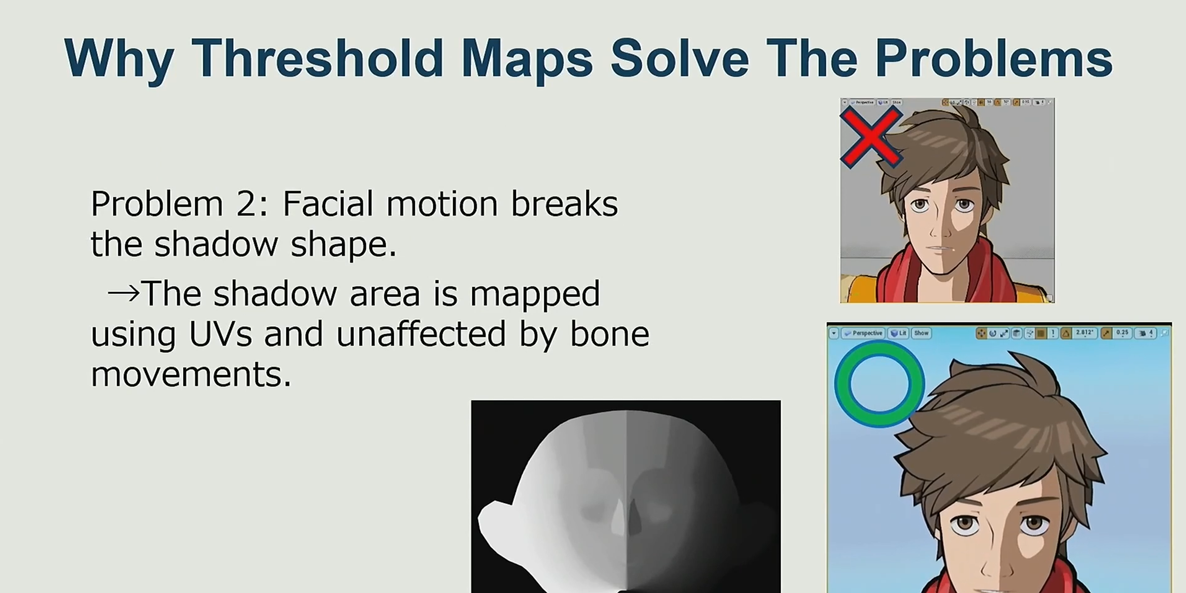 아무튼... 첫 번째 문제는 물론 두 번째 문제가 있음. 캐릭터 얼굴이 디포밍 될 때 버택스 노말을 사용 해서 쉐도잉 처리 하는 점은 문제점이 가장 큼. 알겠지만 얼굴의 본을 사용해서 페이셜 모션을 실행 하면 버택스 오리엔트도 계속 바뀜. 당연히 이 장면은 테스트이며 매우 과장되게 디포밍 한 것임.