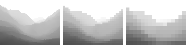 마운틴 데모에는 디버깅 및 데모 목적으로 Hi-Z 맵의 다양한 밉 레벨의 콘텐츠를 표시하는 기능이 내장되어 있습니다. 이 기능은 Hi-Z 맵 기반 오클루전 컬링이 활성화된 상태에서 F2 키를 누르면 사용할 수 있습니다. 키 + 및 -를 사용하여 밉 레벨을 전환할 수 있습니다.