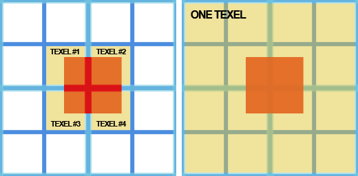 참조 깊이 값을 계산할 때 2×2 텍셀 풋프린트를 사용하는 이유는 다음 밉 레벨을 한 번만 가져오면 되지 않느냐고 질문할 수 있습니다(Hi-Z 맵 구성 방식으로 인해 2×2 텍셀 풋프린트의 최대값도 얻을 수 있기 때문입니다). 저도 처음에 의문이 들었지만 곧 그 이유를 알아냈습니다(아래 그림 참조).