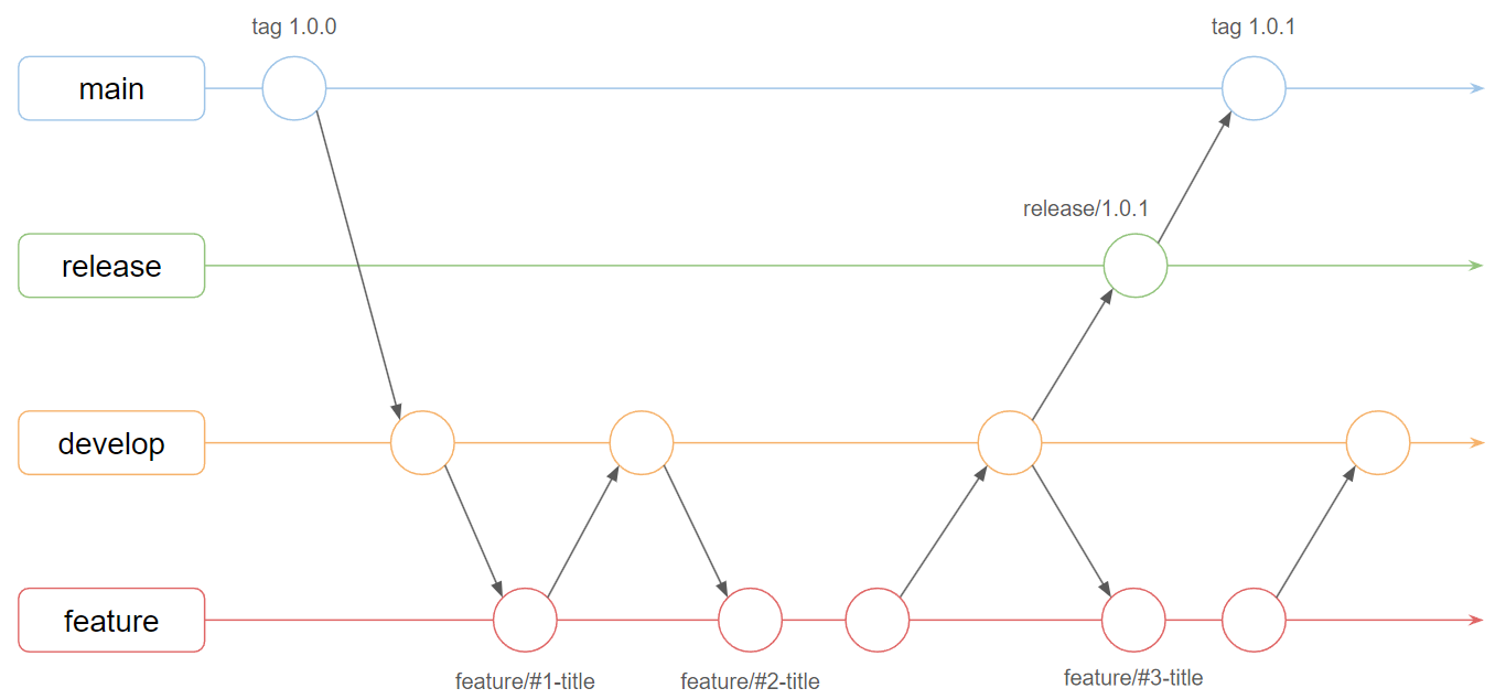 Git-flow를 기반으로 조금 단순화한 것을 채택하고 있습니다.
