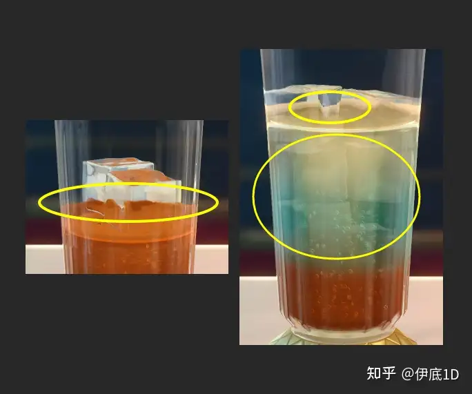1、직관적으로 이 효과는 액체, 얼음, 유리의 세 가지 레이어로 구성됩니다. 유리의 벽이 얇고 안팎의 모양이 동일한 경우 액체와 유리는 단일 재료 구현으로 병합된 것으로 간주할 수 있습니다(이 문서에서는 분리되어 있음).