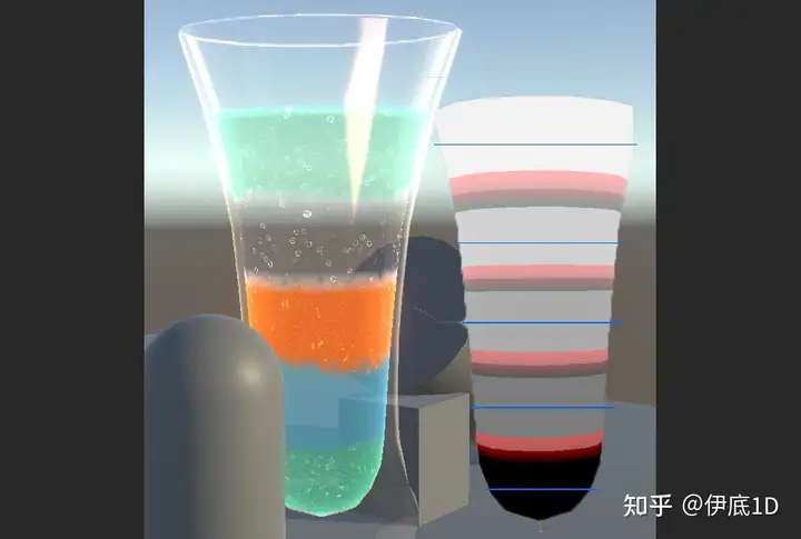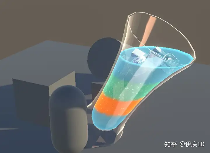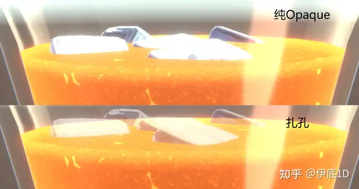 —— 이 기사의 구현에서는 얼음과 액체의 굴절과 배경은 무시하고 얼음 뒤의 액체만 얼음을 통해 보이는 것으로 간주하고 얼음 앞의 다른 투명도 액체를 투명하게 혼합하는 것을 고려합니다. 전자는 전체 얼음 조각에 균일한 지그재그 반투명도를 적용하여 시뮬레이션하고, 후자는 얼음 조각을 액체 앞에 렌더링하고 액체의 알파블렌드 모드를 사용하여 실제 투명도 블렌딩을 수행합니다.