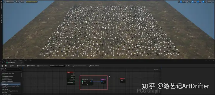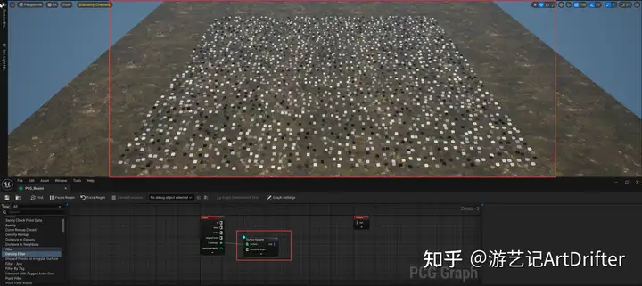 PCG 차트에서 노드를 선택하고 키보드의 "D" 키를 누르면 레벨에 노드 데이터가 시각적으로 표시됩니다. 예를 들어 디버깅이 활성화된 표면 샘플러는 포인트의 분포와 밀도를 PCG 차트에 포함된 지형에서 다양한 그레이 스케일 색상의 사각형으로 표현할 수 있습니다. 노드를 디버그 노드에 연결하여 동일한 작업을 수행할 수 있습니다.