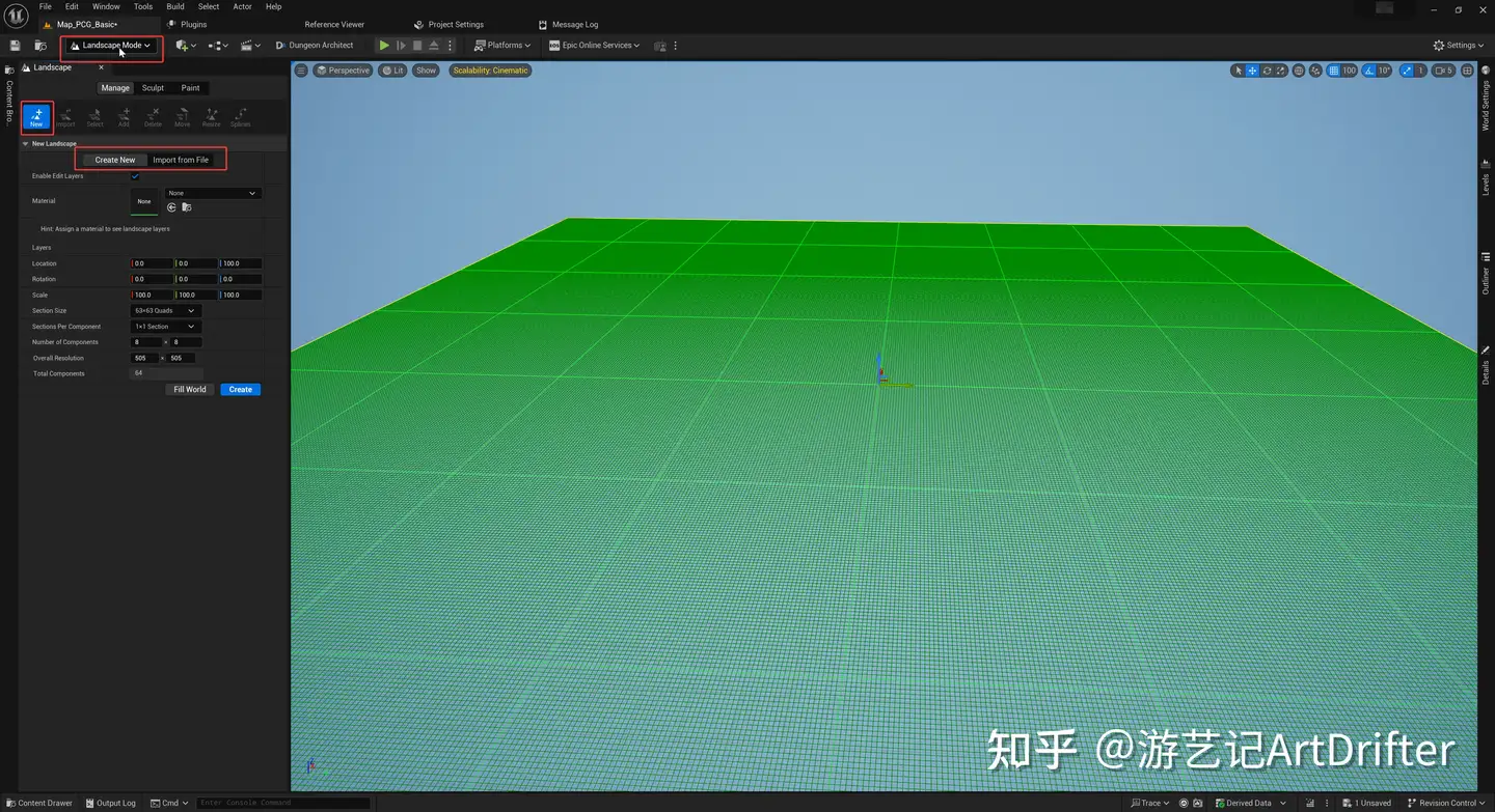 랜스케이프 모드로 전환한 다음 빈 평면 지형을 새로 만들거나 높이 맵을 임포트하여 지형을 만듭니다.