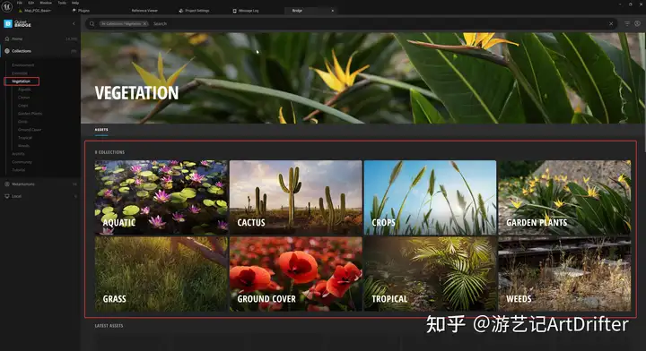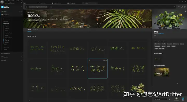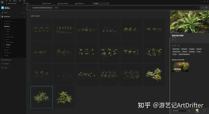 - 식생 모델은 퀵셀 브리지에서 무료로 다운로드할 수 있으며(에픽 계정은 로그인 후 다운로드 가능), 마음에 드는 식생 모델을 개별적으로 다운로드하거나 비슷한 지리적 환경의 식생 중에서 선택할 수 있습니다. 식생을 선택하는 과정에서 식생의 성장과 분포 패턴에 대해 생각하고 연구하며 다양한 식생 유형과 크기를 선택할 수 있습니다. 다운로드한 후에는 '추가' 버튼을 사용하여 현재 프로젝트에 에셋을 추가해야 합니다.