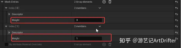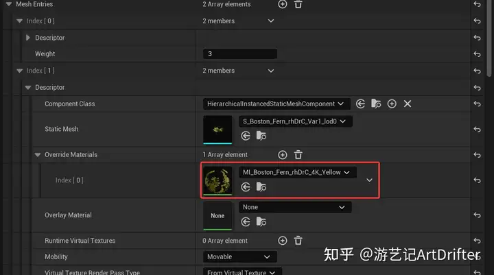 이 노드는 입력 포인트 데이터를 사용하여 포인트 위치에 다양한 스태틱 메시를 생성할 수 있습니다. 이 노드의 설정에서 스태틱 메시의 유형과 각 유형에 대한 생성 가중치를 설정하여 각 유형이 생성될 확률을 결정할 수 있습니다. 이 노드 설정의 메시 항목 배열에 여러 항목을 추가하고 다른 스태틱 메시 모델을 할당하고 머티리얼을 재정의합니다. 오버라이드 머티리얼 옵션을 사용하면 다양한 색상의 식물을 생성하고 동일한 모델에 다른 오버라이드 머티리얼을 사용하여 다른 색상이 나타날 확률을 제어할 수 있습니다. 노드의 입력 및 출력 포트는 모두 여러 데이터에 대한 동시 액세스를 지원합니다.