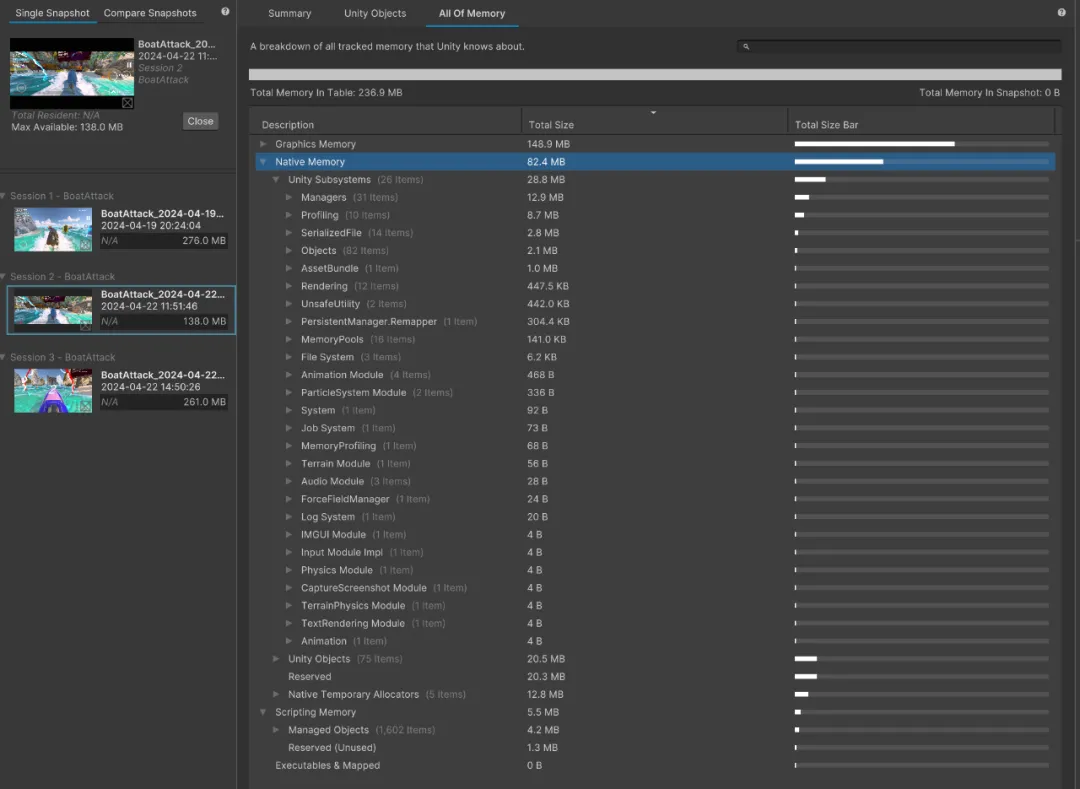 Unity 메모리 프로파일러는 소규모 게임의 메모리를 최적화하는 데 유용한 툴입니다. Unity 프로파일러와 마찬가지로 게임을 패키징하고 LAN에서 실행할 때 개발 빌드 및 자동 연결 프로파일러를 확인해야 합니다.