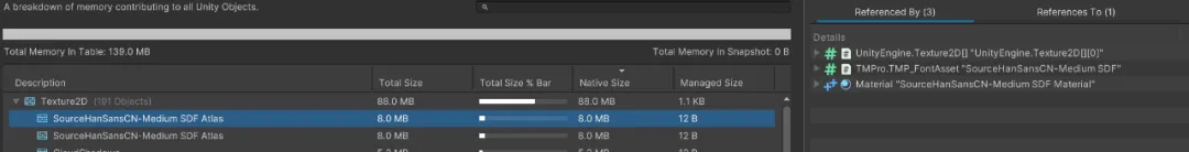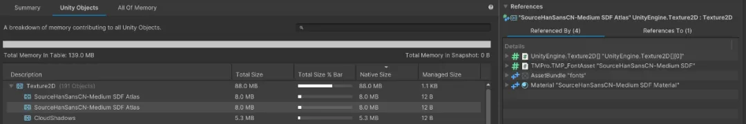 Unity 오브젝트 페이지에서 이름이나 크기별로 정렬하여 중복된 리소스를 빠르게 찾을 수 있습니다. 오른쪽의 레퍼런스를 비교하여 중복의 원인을 분석할 수 있습니다. 예를 들어 아래 이미지에는 AB와 씬에 중복된 TMP 텍스처가 두 개 있습니다. 씬과 AB의 UI는 동일한 TMP 폰트 리소스를 동시에 참조하므로 패킹 구조를 조정하여 이 중복 문제를 해결할 수 있습니다.