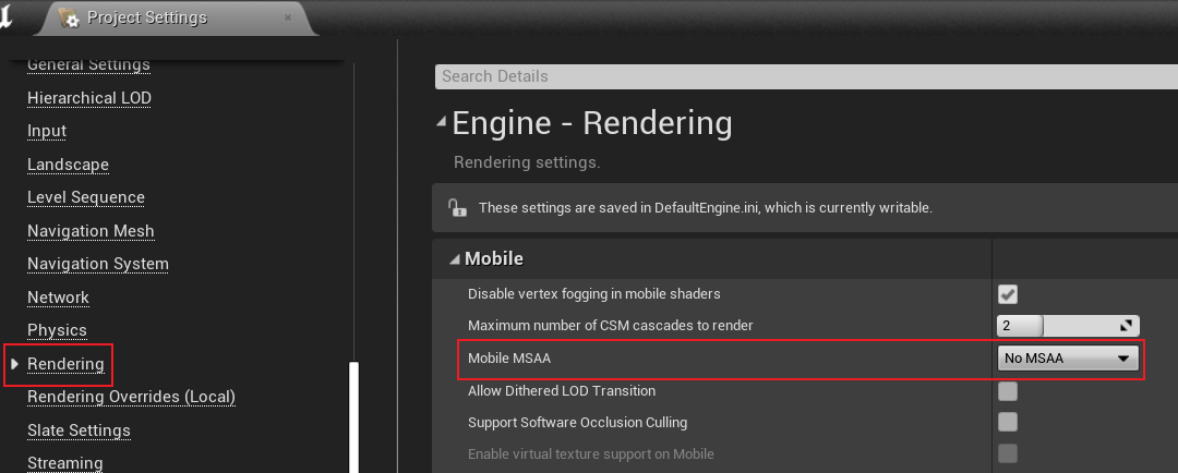 MSAA는 자연스러운 하드웨어 지원과 효과와 효율성의 좋은 균형으로 인해 모바일에서 UE 포워드 렌더링을 위한 안티앨리어싱으로 선택되고 있습니다. 따라서 위 코드에는 컬러 및 뎁스 텍스처와 그 리소스 상태를 포함하여 MSAA 처리를 위한 로직이 상당히 많이 등장합니다. MSAA가 켜져 있으면 기본값은 (칩 청크의 데이터를 시스템 그래픽 메모리에 다시 쓰는 동안) RHICmdList.EndRenderPass()에서 씬 컬러를 파싱하여 앤티앨리어싱 텍스처를 가져오는 것입니다. MSAA는 모바일에서 기본적으로 활성화되지 않지만 다음 인터페이스에서 설정할 수 있습니다: