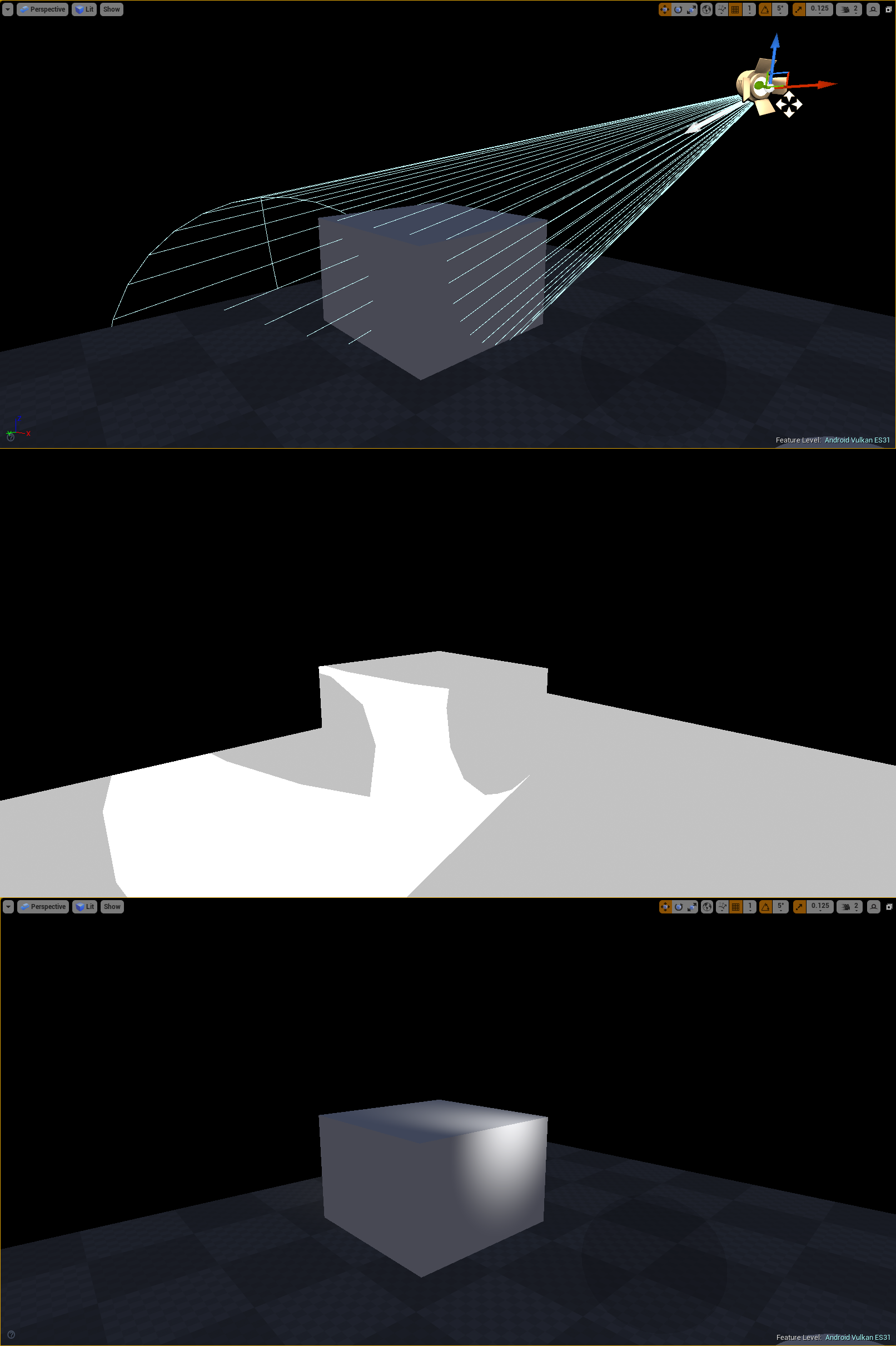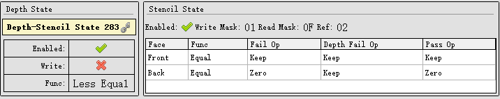 위: 렌더링을 기다리는 장면의 스포트라이트, 가운데: 템플릿패스를 사용하여 그려진 템플릿 마스크(흰색 영역)로, 화면 공간에서 스포트라이트 모양과 겹치고 깊이가 더 가까운 픽셀을 표시, 아래: 조명 계산이 유효 픽셀에 미치는 영향입니다. 유효한 픽셀의 광원 계산에 사용되는 DepthStencil 상태는 다음과 같습니다:
