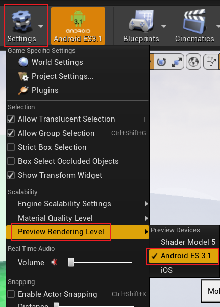 Android의 기본 기능 레벨은 프로젝트 세팅(프로젝트 세팅 &t; 플랫폼 &t; )에서 구성할 수 있으며, 특정 머티리얼 파라미터를 구성할 수 있습니다. 안드로이드 머티리얼 품질 - ES31)을 참조하여 특정 머티리얼 파라미터를 구성할 수 있습니다.