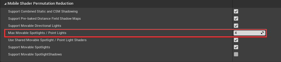 위에 더 많은 코드가 있지만, 이는 여러 매크로에 의해 제어되며 실제로 단일 머티리얼을 렌더링하는 데 필요한 코드는 그 중 아주 작은 부분일 수 있습니다. 예를 들어 기본적으로 4개의 로컬 광원이 지원되지만 프로젝트 구성(아래)에서 광원을 2개 이하로 설정할 수 있다면 실제로 실행되는 광원 명령어는 훨씬 더 적습니다.