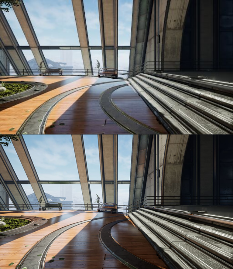 위: 포워드 렌더링, 아래: 지연 렌더링. 모바일에서 디퍼드 렌더링을 활성화하려면 프로젝트 구성 디렉터리의 DefaultEngine.ini에 r.Mobile.ShadingPath=1 필드를 추가하고 에디터를 다시 시작해야 합니다.